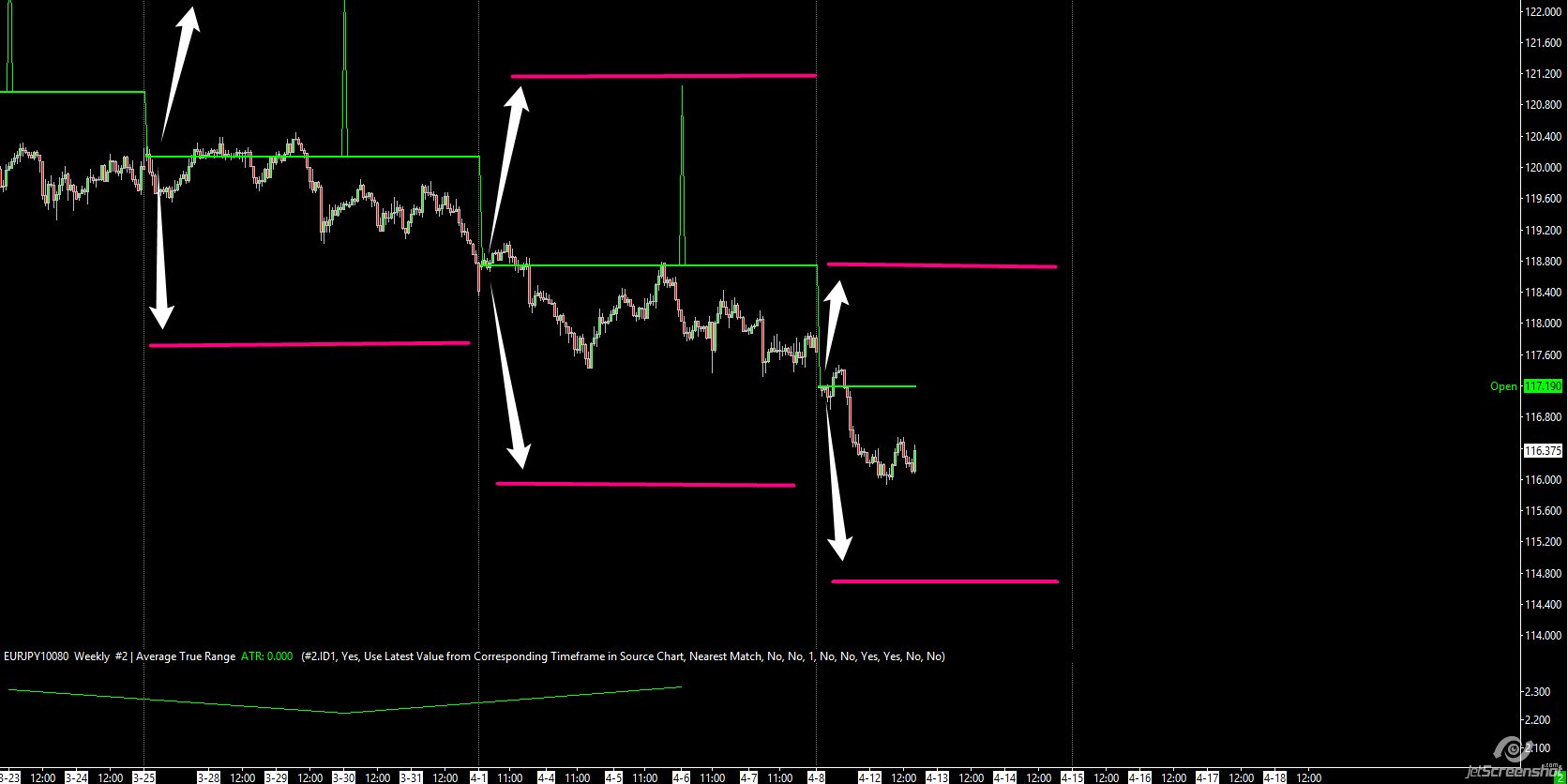 thanks, So there are these ATR spikes instead of just bands, So I'd like the ATR value of the weekly ATR added and subtracted from the weekly open, but it wont quite work for me . Thanks for your help |