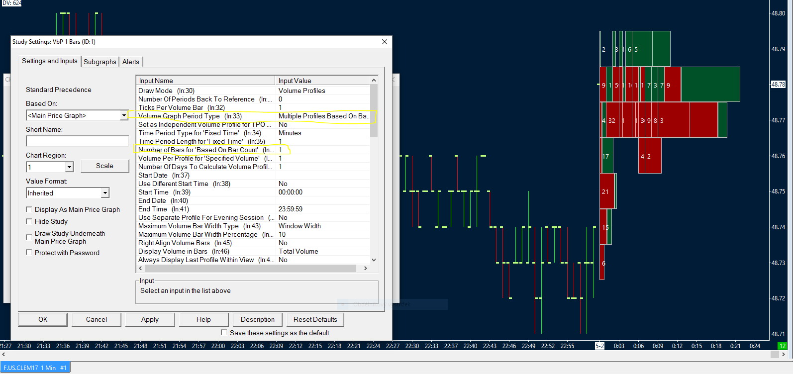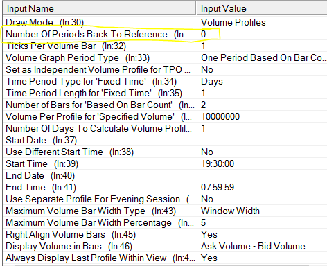 You will have a Volume Profile for each chart bar with Volume Graph Period Type: Multiple Profiles Based on Bar Count Make sure you set this Input to Period Type: https://www.sierrachart.com/index.php?page=doc/VolumeByPrice.php#Input_MaximumVolumeBarWidthType Sierra Chart Support - Engineering Level Your definitive source for support. Other responses are from users. Try to keep your questions brief and to the point. Be aware of support policy: https://www.sierrachart.com/index.php?l=PostingInformation.php#GeneralInformation For the most reliable, advanced, and zero cost futures order routing, *change* to the Teton service: Sierra Chart Teton Futures Order Routing |