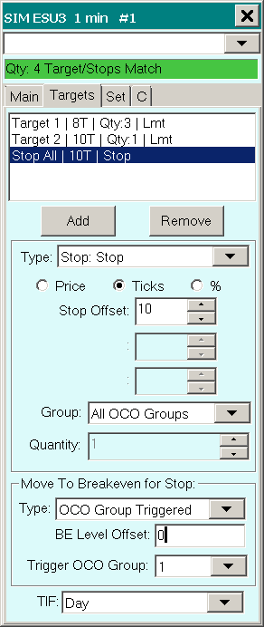 If I want ........ 3 orders to with a target of lets say 8 ticks AND 1 order with a target of lets say 10 ticks How do I get a Stop Order to cover all 4? and then how do I get the remaining stop once target 1 [ 3 orders ] has been reached to move to break even. |