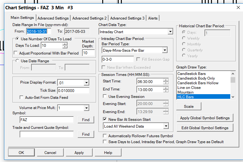Yes you are right it is about 6 month, sorry, just getting a little frustrated as i see the potential, just hard to get it set up! I'm sorry if I keep going back to this same ? but is it possible to have IB data with the SC backup data, have other users been able to get it to work? And I did apply Global Settings >> Data/Trade Service Settings. as outlined but as I have multiple tabs open of the same symbol ranging in time frames now all the tab charts load 10 days even the ones I want to load 60 days to a year worth of data, how can I get this to have separate settings for each tab chart? I was using the chart setting number of days to load but was getting the 6 months of data when I had 10 days in settings! Thanks again for your time and more importantly your patients :) |