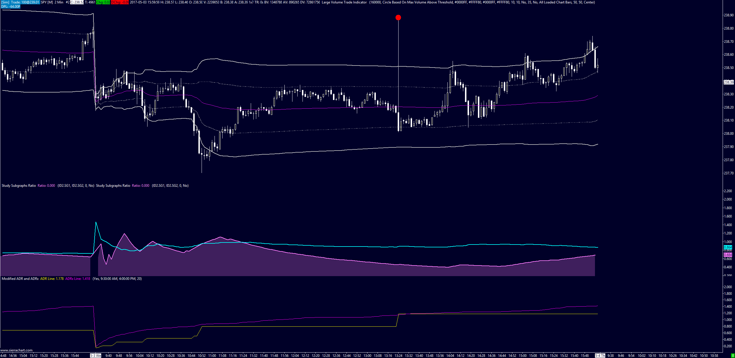 Is it possible to add a trade filter to the chart settings, where trades that were x % or x ticks away from the last trade price were excluded from the chart? I'm having some trouble with US equities, where large block Intermarket sweep orders are being executed well away from the last trade price. This then skews my studies, and potentially triggers stop orders. For example, today in SPY there was a single print FINRA "F" type order for 161k reported @ 238.8775. Which exceeded the current daily high($238.49), and was well above the last trade price($238.18) http://www.sierrachart.com/image.php?Image=1493848668304.png Date Time Of Last Edit: 2017-05-03 23:16:59