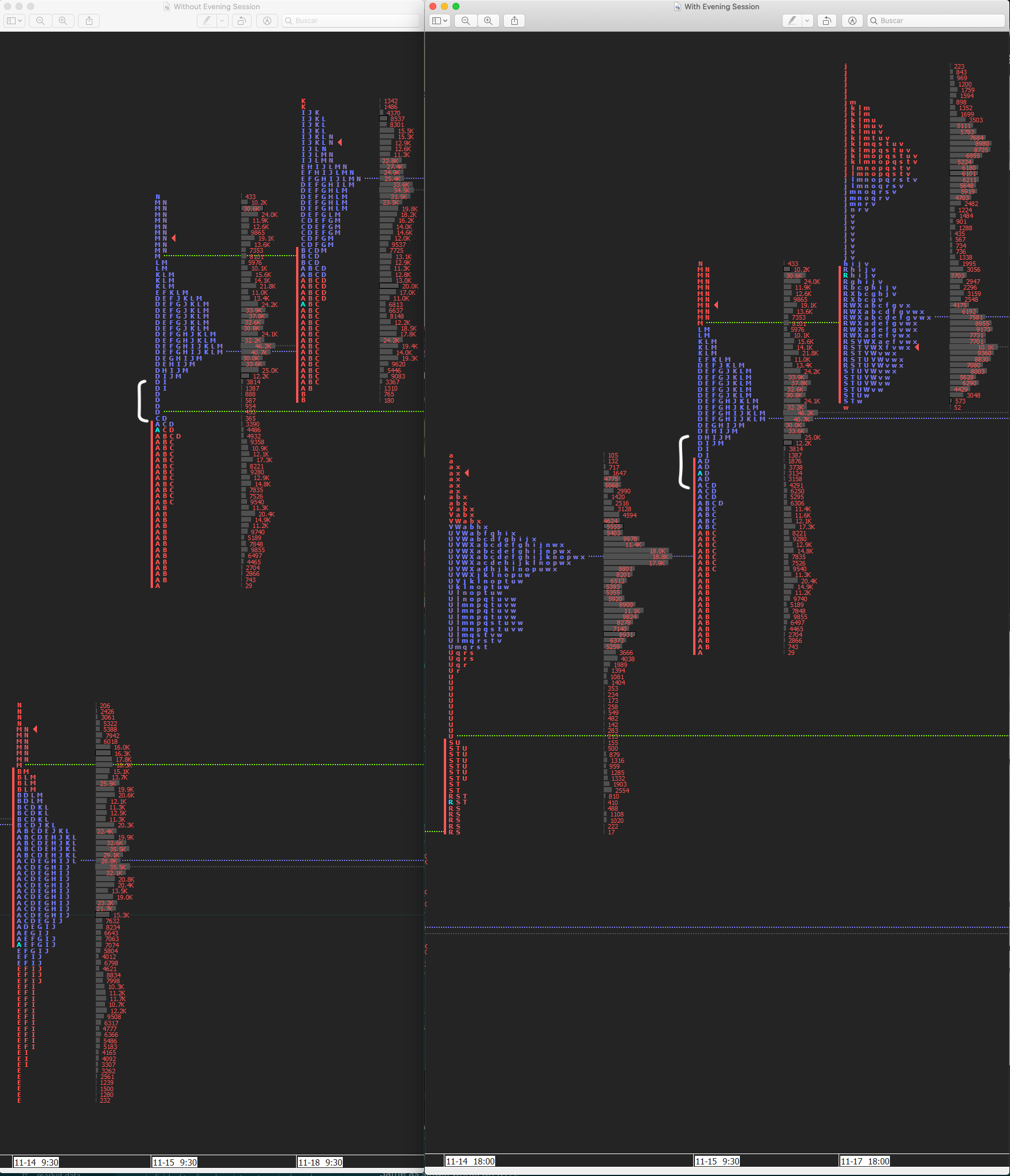 I am having problems with this functionality. Maybe my settings have something wrong. When I exclude the evening profiles, sometimes one of my regular market hour profiles changes. You can see the image, when I exclude I got single D's, and when I have Evening session, I do not. This is from 15 november 2019 on ES.