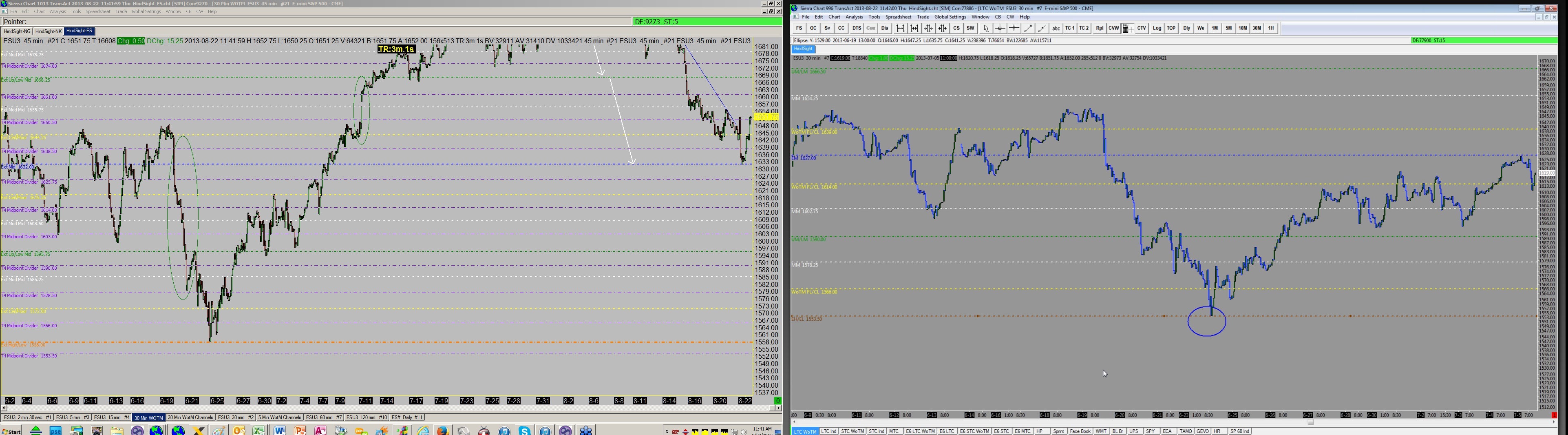 Hi guys, Odd one. On the ES, I got a different low on June 23 on my desktop vs our trade room. The attached picture is from my desktop. The left view is my PC which shows a low of 1558. The right is a GoTo Meeting with our trade room where Gary has a low of 1553.50. I did the Delete and Reload - no change. I went back four contracts and did four rollovers - no change. The same problem was happening on my laptop. I went back four contracts and did four rollovers - and now have 1553.50 on my laptop. Still have 1558 on my desktop. Any suggestions ? Appreciate any feedback or suggestions on what I might have out of sync. Thanks so much, Mike |