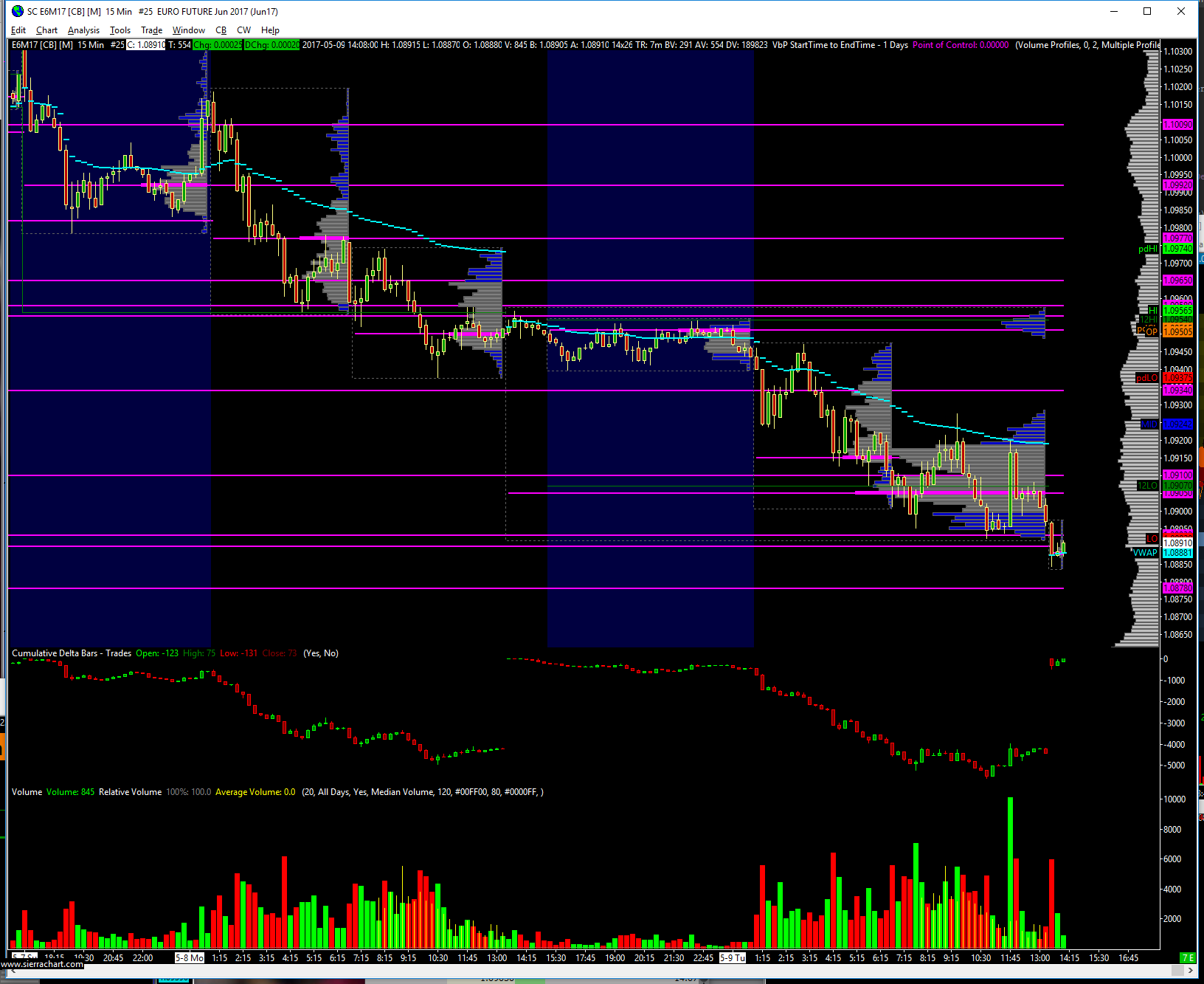 I have had a 24 hour chart set up for Euro futures (E6 contract). I have a separate profile for Asia session (15:15-00:59:59), Europe session (01:00-06:59:59), and US Session (07:00-15:14:59). Recently the settings seem to be reverting to have the wrong session time set on the chart and this messes up the profiles. See the attached images. I can change the session back to 24 hrs with no evening session (15:15-15:14:59). After saving the settings, the chart loads once and looks correct for a second, and then reloads and looks wrong again (like the attached screenshot) and the session settings have reverted. Here is an upload of the messed up chart. Also notice one of the images I upload where I point out a profile artifact that looks like it should go with the latest profile for the last few bars (circled in red). http://www.sierrachart.com/image.php?Image=1494356888943.png |