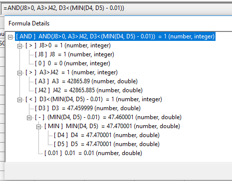 In formula columns, you should use absolute references to J8 and J42: =AND($J$8>0, A3>$J$42, D3<(MIN(D4, D5) - 0.01)) |