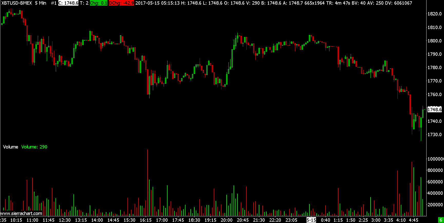 This is what we see for that symbol with 5 minutes per chart bar: http://www.sierrachart.com/image.php?Image=1494825317686.png The time zone is UTC. Is that what you are seeing? We do not see any obvious problems. The market data from BitMEX is also provided using a standardized protocol which is the DTC Protocol. So if there is a problem it is much more likely to be something they would need to resolve from their side. Sierra Chart Support - Engineering Level Your definitive source for support. Other responses are from users. Try to keep your questions brief and to the point. Be aware of support policy: https://www.sierrachart.com/index.php?l=PostingInformation.php#GeneralInformation For the most reliable, advanced, and zero cost futures order routing, *change* to the Teton service: Sierra Chart Teton Futures Order Routing Date Time Of Last Edit: 2017-05-15 05:19:23