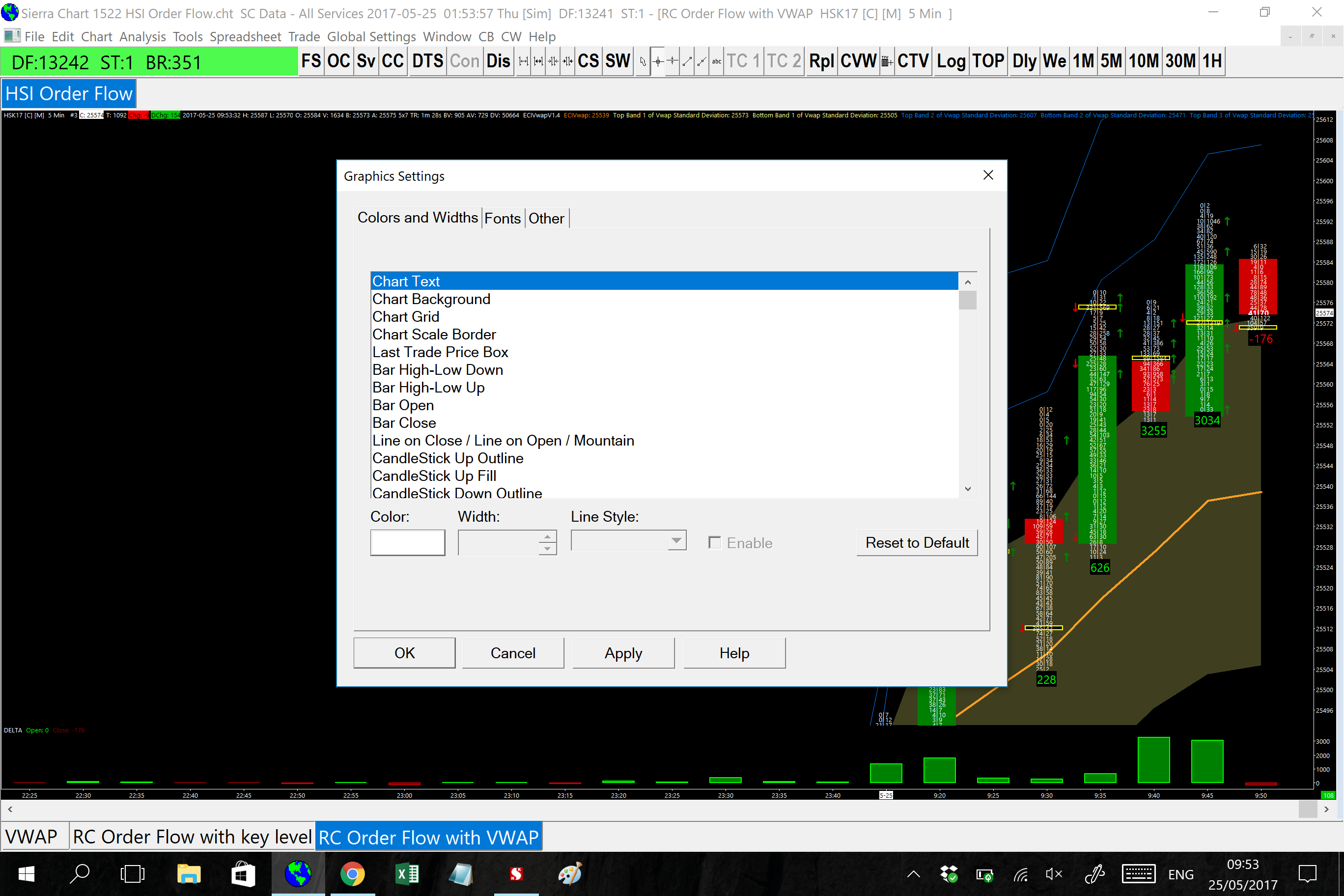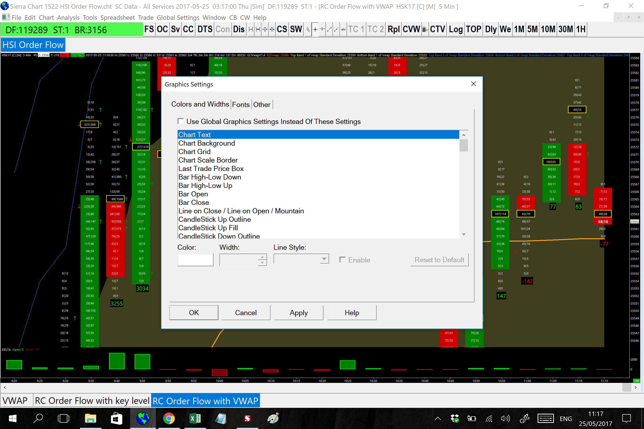 Why cannot you change the font size through Global Settings >> Graphics Settings >> Fonts? If it has no effect, then you need to set it through Chart >> Graphics Settings >> Fonts. Here is the relevant documentation: Graphics Settings Sierra Chart Support - Engineering Level Your definitive source for support. Other responses are from users. Try to keep your questions brief and to the point. Be aware of support policy: https://www.sierrachart.com/index.php?l=PostingInformation.php#GeneralInformation For the most reliable, advanced, and zero cost futures order routing, *change* to the Teton service: Sierra Chart Teton Futures Order Routing Date Time Of Last Edit: 2017-05-25 03:08:36