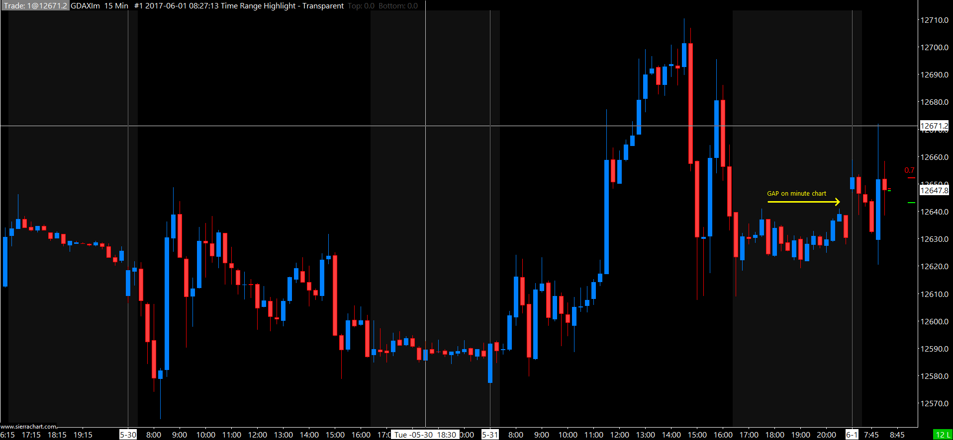Good morning, I can't find any option that allow me to see where the market close in the evening and reopen the day after. I just have 2 normal bar as the session continues but if I am going to see the same chart on another time frame, such as minute chart, I can notice the existing gap between the closing and opening time. In both chart the session has been set from 7:00a.m. to 20:59:59pm (as per London session) Please, find attached to see what I mean. How can I do in order to fix the problem? Thanks, Fabio. http://www.sierrachart.com/image.php?Image=1496301996821.png http://www.sierrachart.com/image.php?Image=149630203516.png |