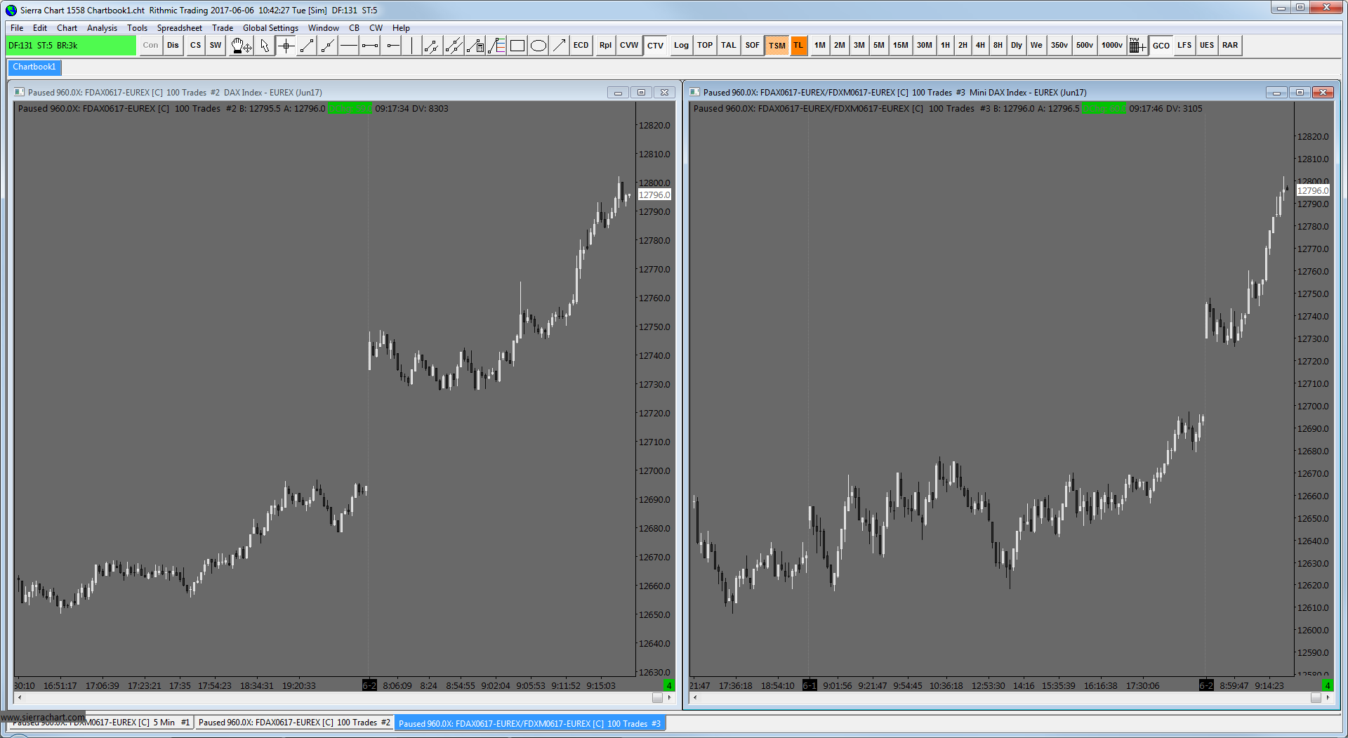 How do you chart one symbol and trade another as in charting the FDAX and trading the FDXM (mini dax)? If you use the "Study Price Overlay" study on non-minute periods the bars are all unmatched with different spacing etc. If you use the Chart Settings window with a different symbol in the "Trade and Current Quote Symbol" box, that is the symbol that ends up being charted and not the symbol in the "Symbol" box. http://www.sierrachart.com/image.php?Image=1496738550629.png |