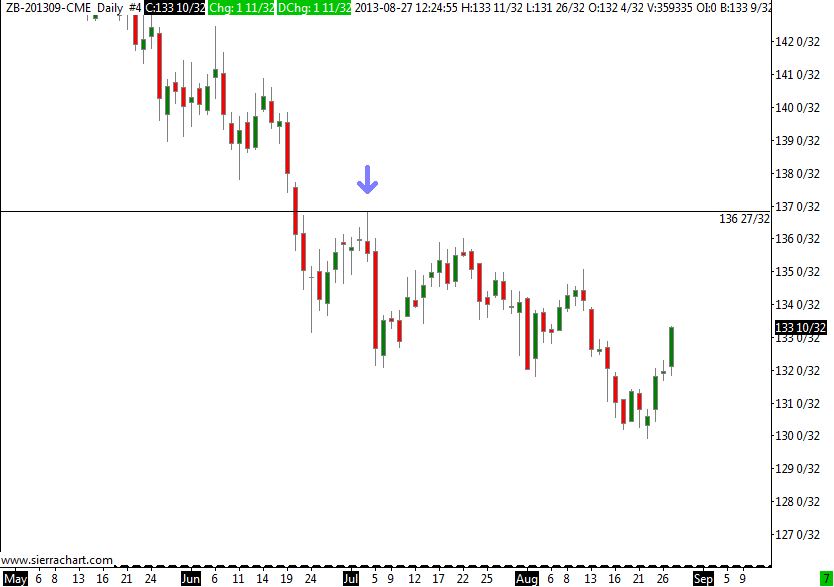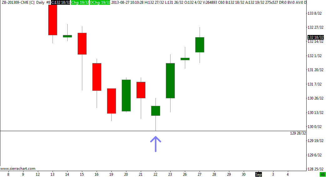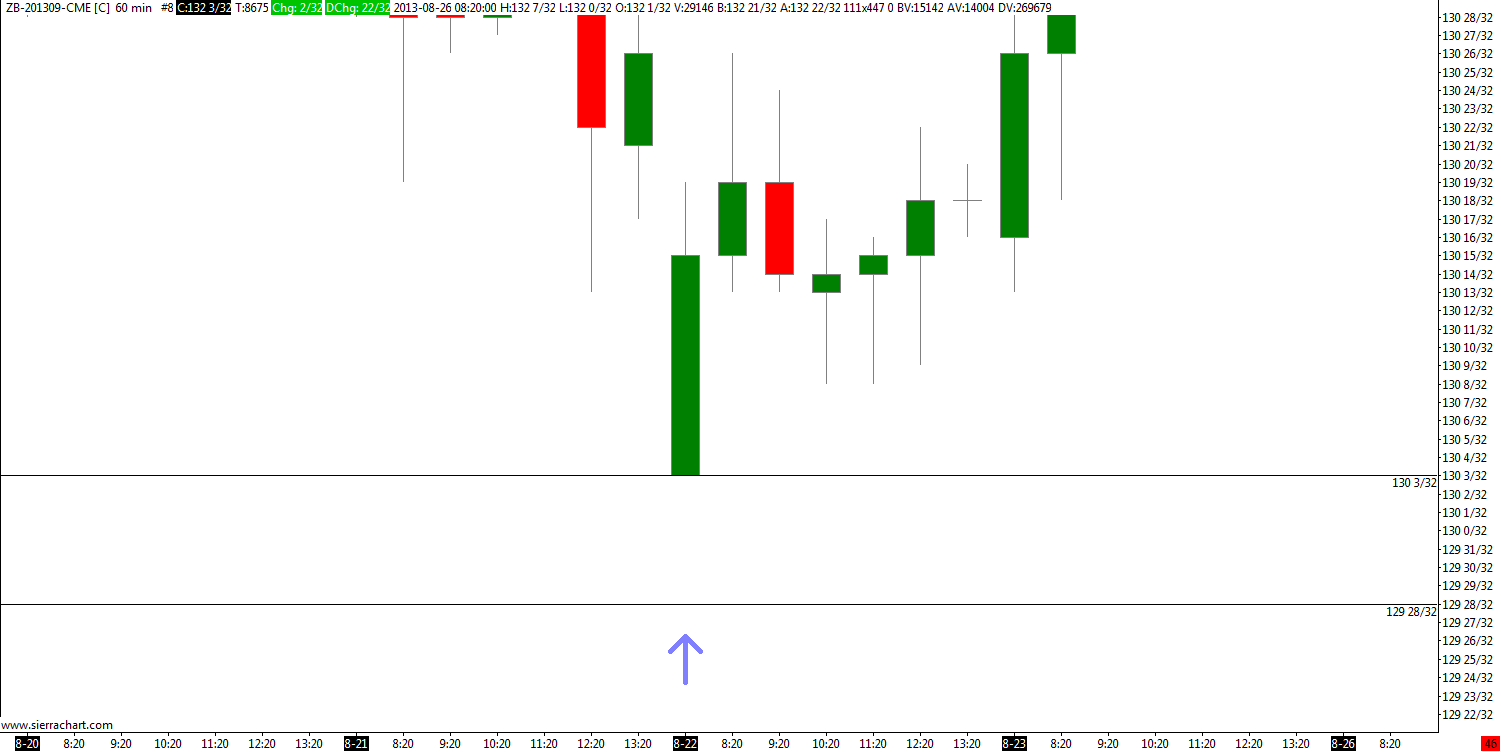 The following link shows a daily chart of ZB-201309-CME with a swing low that occurred on 8/22/2013 at a price of 129 28/32. http://www.sierrachart.com/image.php?l=1377616255367.png The next link shows a 60 min chart of the same symbol with the same swing low at a price of 130 3/32. http://www.sierrachart.com/image.php?l=137761670265.png Similar conditions exist on the ZN and ZF contracts, just different values, of course. "Delete All Data and Download" for each symbol made no difference. |