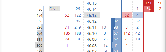 First, I want to thank SC for providing hands down the best DOM on the market. The possibility to overlay studies on the DOM is just awesome. There is a problem with the drawing of the recenter line though. Consider the screenshot attached: the recenter line crosses through the depth of market information and the recent/current columns. This makes the numbers illegible ... I had to turn the line off to be able to use the DOM properly. Drawing the line above/below the mid-distance between bid/ask would solve that problem. I do understand that this would cause potential issues with an uneven spread; but I think that even if the line were slightly off of the center, say always at the top of the row where it is drawn now, it would improve the utility of the feature considerably. Alternatively, providing a transparency value or pushing the line to the very back of the rendering sequence could alleviate the problem. |