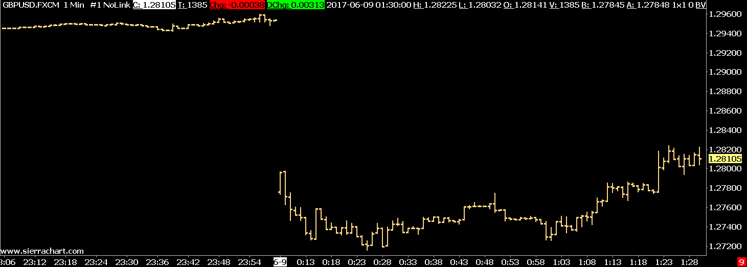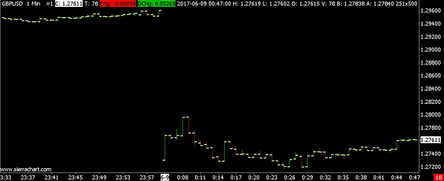We were mistaken when we said we do not see the missing data on LMAX. We do see the missing data there as well: http://www.sierrachart.com/image.php?Image=1497636891384.png So this is 2 completely separate services missing data for that symbol at that particular time. Obviously GBP USD was not trading on either of those services at that time. Both of those are major Forex trading services. So we really have no solution to offer. This is just how it is. But consider using LMAX. Maybe this will be less of a problem. Sierra Chart Support - Engineering Level Your definitive source for support. Other responses are from users. Try to keep your questions brief and to the point. Be aware of support policy: https://www.sierrachart.com/index.php?l=PostingInformation.php#GeneralInformation For the most reliable, advanced, and zero cost futures order routing, *change* to the Teton service: Sierra Chart Teton Futures Order Routing Date Time Of Last Edit: 2017-06-16 18:16:44