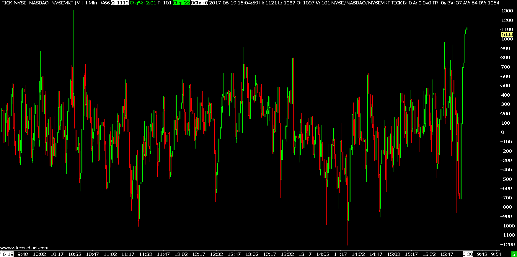 Update: we realize that the NYSE Market exchange was not included in the calculation for Monday but it will be on Tuesday and going forward. Otherwise, this looks like a useful statistic because it does provide a much wider range of values compared to TICK-NYSE. Here is a chart of it: http://www.sierrachart.com/image.php?Image=1497915838328.png Sierra Chart Support - Engineering Level Your definitive source for support. Other responses are from users. Try to keep your questions brief and to the point. Be aware of support policy: https://www.sierrachart.com/index.php?l=PostingInformation.php#GeneralInformation For the most reliable, advanced, and zero cost futures order routing, *change* to the Teton service: Sierra Chart Teton Futures Order Routing |