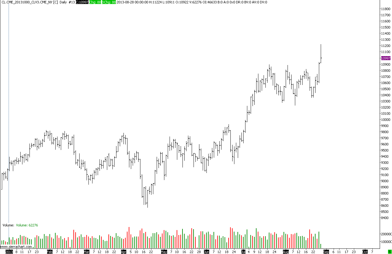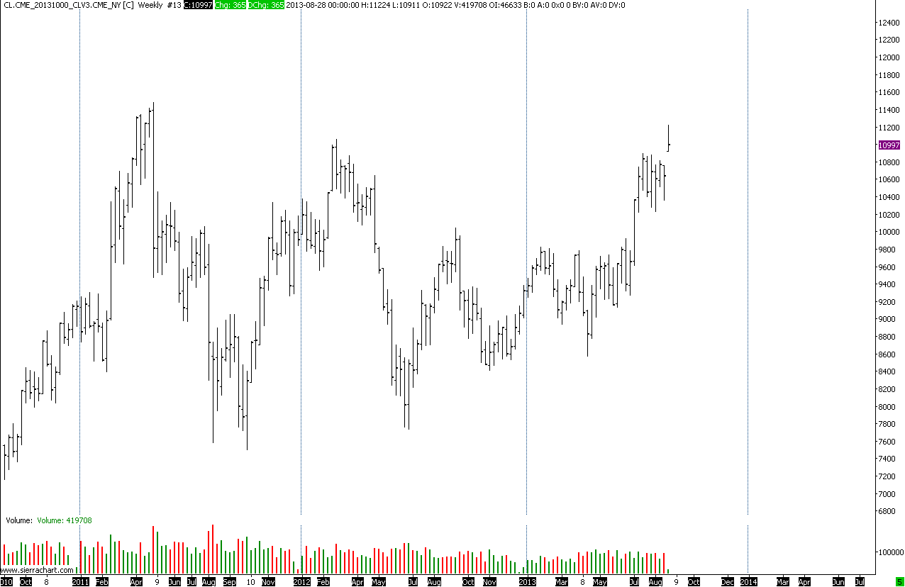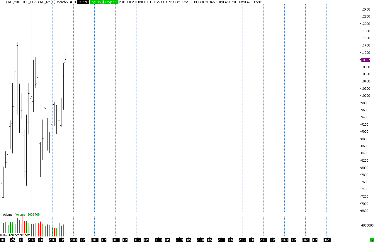 Hi, please look at the weirdness and differences of these continuous charts: daily, weekly and monthly of October CL contract (new FIX/CTS service). http://www.sierrachart.com/image.php?l=1377681123660.png http://www.sierrachart.com/image.php?l=1377681164515.png http://www.sierrachart.com/image.php?l=1377681359440.png The daily chart seems ok, but when you switch to a higher timeframe something goes wrong. Thank you. |