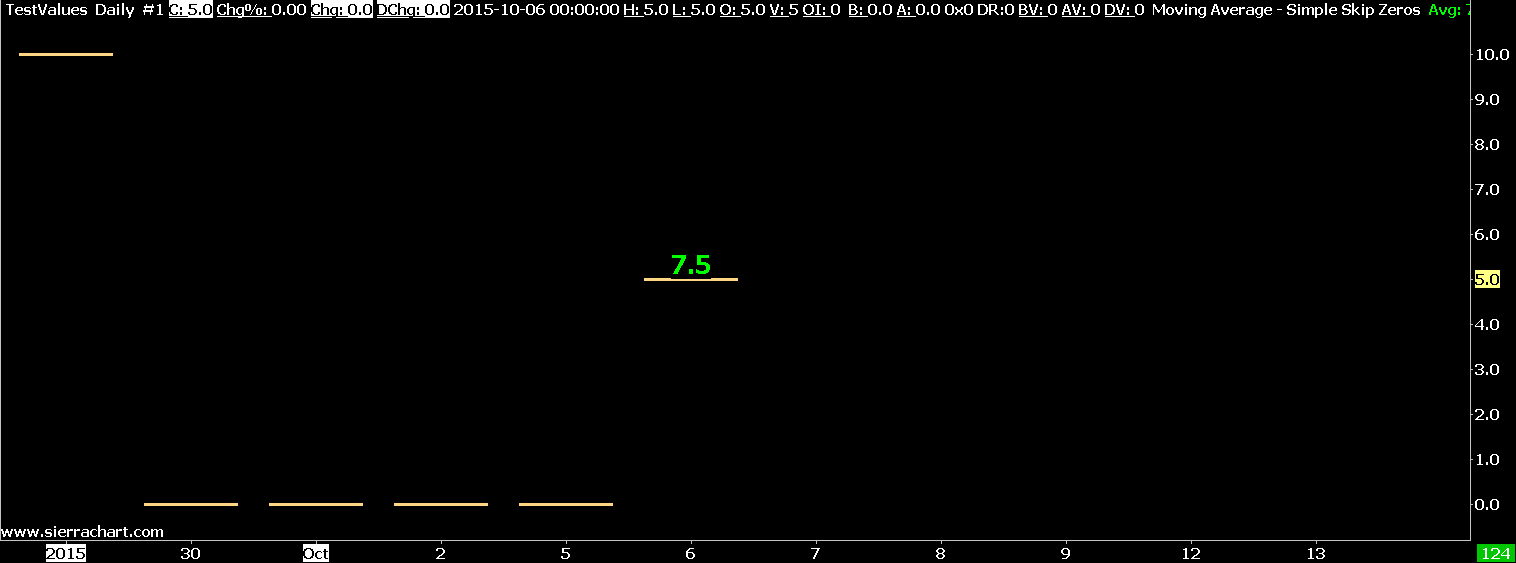 How do both of you come to this conclusion? This is not what MOVAVGTYPE_SIMPLE_SKIP_ZEROS actually does. And can be easily verified by looking at the provided code. The mathematical formula is also given here:https://www.sierrachart.com/index.php?page=doc/StudiesReference.php&ID=353#Moving_Average_-_Simple_Skip_Zeros Sierra Chart Support - Engineering Level Your definitive source for support. Other responses are from users. Try to keep your questions brief and to the point. Be aware of support policy: https://www.sierrachart.com/index.php?l=PostingInformation.php#GeneralInformation For the most reliable, advanced, and zero cost futures order routing, *change* to the Teton service: Sierra Chart Teton Futures Order Routing Date Time Of Last Edit: 2017-06-28 22:51:53