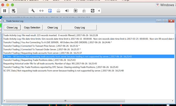Hi, I am a paid Seirra Chart user. I have been using simulated version so far for my practice. But, today, I am switching to Live with Transact Service. I followed every point mentioned in your documentation such as: 1. Switching to "Connection Type" to Live. 2. Unchecking the "Trade Simulation Mode On" 3. Checking the "Chart Trade On" But every time I issued a live order this morning, it was NOT going through. The Trade Log said this: Not requesting trade accounts from server because trading is Not supported by Server. I am attaching all the screenshots. I asked my Rep over at Tranact Futures and they said, everything is fine from their end and they are NOT seeing any orders coming from Seirra Chart. Can you please look into this issue ASAP. Appreciate your help. Date Time Of Last Edit: 2017-06-26 21:01:13