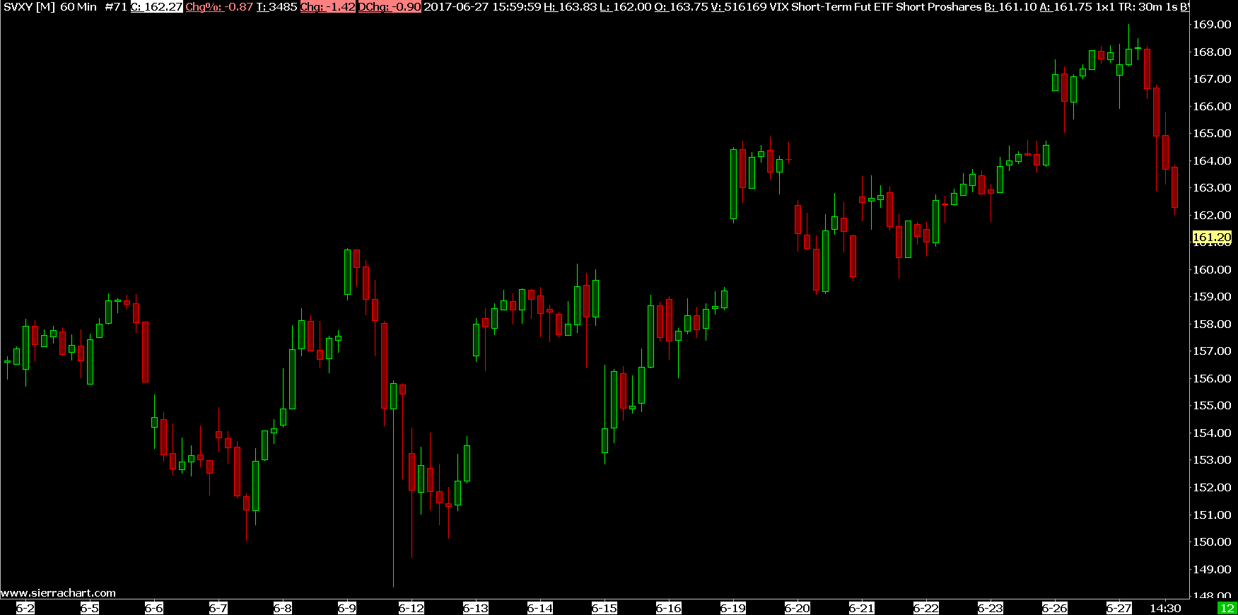 Hello there, I have just noticed that the price data for two securities SVXY and UVXY in Sierra Charts are completely wrong and do not match what is from IB at all. I have full subscription to real-time data for both of these securities in IB and I have always noticed that the price isa little off but I have dismissed as Sierra Charts having the timestamp not exactly matching with IB but today, the prices are completely off. The price for SVXY at the end of the day today was 162.10 in IB's TWS (please see attached screenshot file) and the the price for the same security in Sierra Charts is 168.20, a $7 difference!! And the price chart pattern is completely different (Please see attached screenshot file). And also when I was downloading the price from IB today after their daily maintenance at 17:00 PM, I received a lot of errors in the log such as "Array is unallocated" and Window Exception error (Please see also the log file attached). I have NEVER seen these errors before when downloading price data. I had to shut down Sierra Charts and relaunch it. When I relaunched Sierra Charts, the charts got updated but with the wrong prices. UVXY is just an mirror image of SVXY so it has the same problem. I have "Allow Support for Sierra Chart Data Feeds" checked off. Is this an issue with the Sierra Chart data feeds? Please investigate and advise. Thank you. Date Time Of Last Edit: 2017-06-28 07:34:40