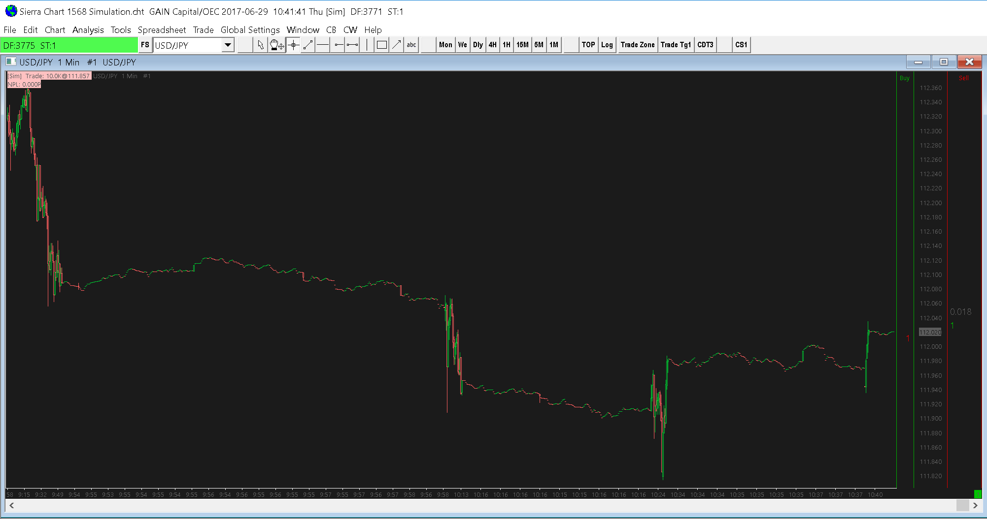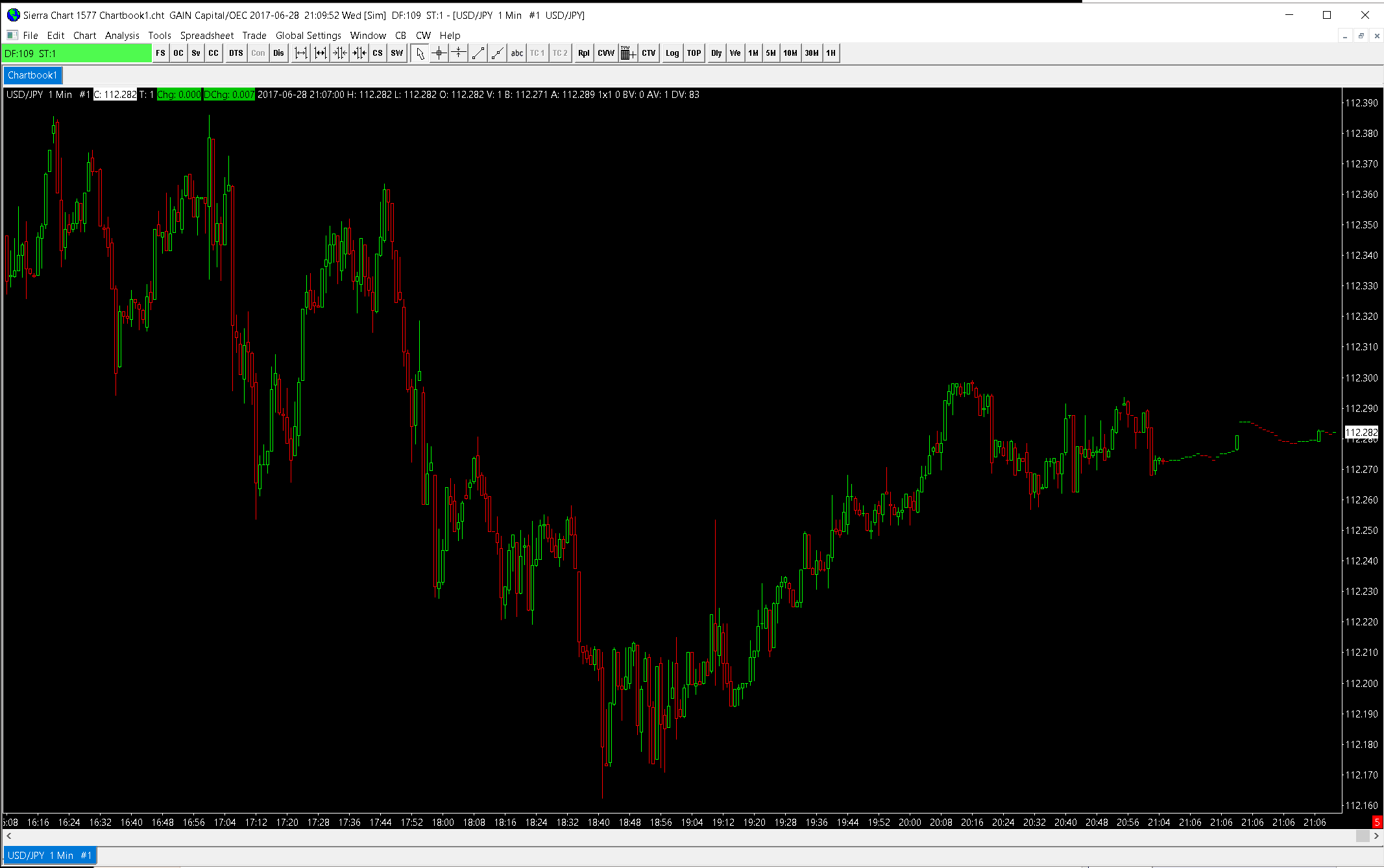 As a test, I did a fresh install and the problem is still occurring. 1. Renamed old sierra charts folder 2. Fresh install to c:\sierracharts 3. Configured GAIN account. Production server. Set Intraday Data Storage Time Unit to 1 second. 4. Created a new intraday chart for "USD/JPY", 1 minute. Problem still occurs. Full screenshot attached Date Time Of Last Edit: 2017-06-29 04:20:16