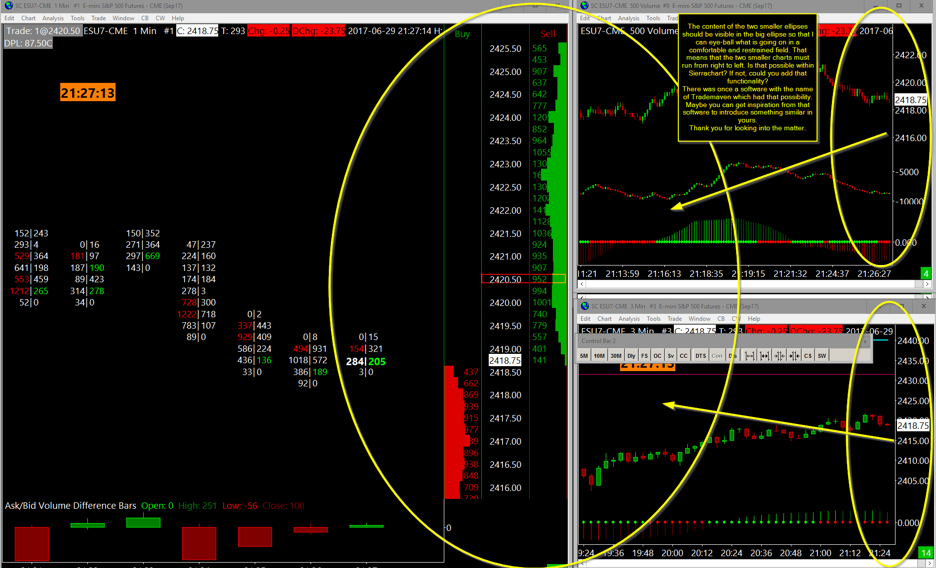 So you are saying that the timescale would actually be descending timewise when looking at it from the left side going towards the right side of the chart. The problem is, this is inherently a very difficult thing to accomplish with the way everything is currently designed. Sierra Chart Support - Engineering Level Your definitive source for support. Other responses are from users. Try to keep your questions brief and to the point. Be aware of support policy: https://www.sierrachart.com/index.php?l=PostingInformation.php#GeneralInformation For the most reliable, advanced, and zero cost futures order routing, *change* to the Teton service: Sierra Chart Teton Futures Order Routing |