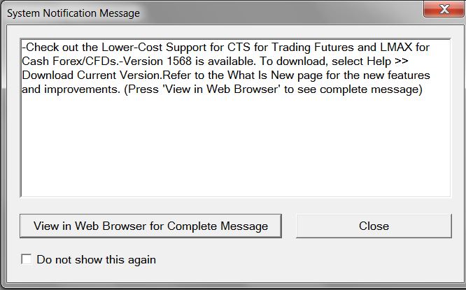No not at all. Nothing. The number of users using the new CTS connection is quite low. Less than 10.That message was put in many months ago to announce the new CTS and LMAX services. We just have not yet removed it. It is not as though it is intended to pop up again and again. But whenever there is a change with the overall message text which in your case there was apparently due to a message about the usage time coming to an end, then the system messages displayed. Also it is nothing more than a single sentence. It is bad enough that your popup dialogs start bugging me 7 days before data services expire to pay up for the following month. These messages are important to inform the user the normal access is going to come to an end. If we did not display this, then normal access to Sierra Chart would be abruptly ended. And we have from time to time received quite harsh complaints when users do not get notified about this. So here it is we receive a complaint about the message, and others have complained when they don't. There is not really much we can do. Those messages must remain. Keeping the user informed about the status of their account is critical, also when it comes to the Sierra Chart Exchange Data Feed and the fact that it is going to be renewed, and what the cost is.And there is the option on the System Notification message window, to prevent it from showing again until there is a change with text. But in your case, there was a change with text related to the usage time coming to an end. Sierra Chart Support - Engineering Level Your definitive source for support. Other responses are from users. Try to keep your questions brief and to the point. Be aware of support policy: https://www.sierrachart.com/index.php?l=PostingInformation.php#GeneralInformation For the most reliable, advanced, and zero cost futures order routing, *change* to the Teton service: Sierra Chart Teton Futures Order Routing Date Time Of Last Edit: 2017-07-01 15:38:31