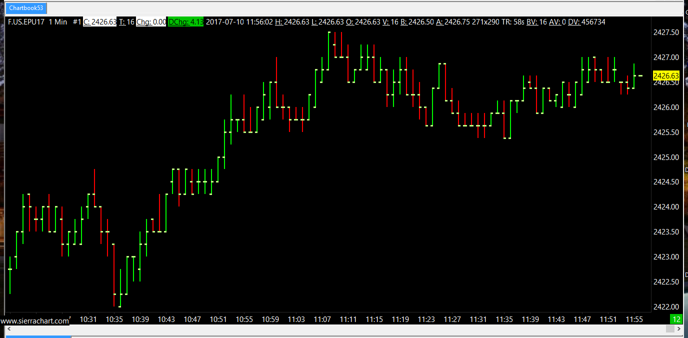 No. The chart bars show the actual prices. Are you noticing the problem at this time? The chart does not appear to have any studies on it. Confirm that is the case. Sierra Chart Support - Engineering Level Your definitive source for support. Other responses are from users. Try to keep your questions brief and to the point. Be aware of support policy: https://www.sierrachart.com/index.php?l=PostingInformation.php#GeneralInformation For the most reliable, advanced, and zero cost futures order routing, *change* to the Teton service: Sierra Chart Teton Futures Order Routing Date Time Of Last Edit: 2017-07-10 17:13:28