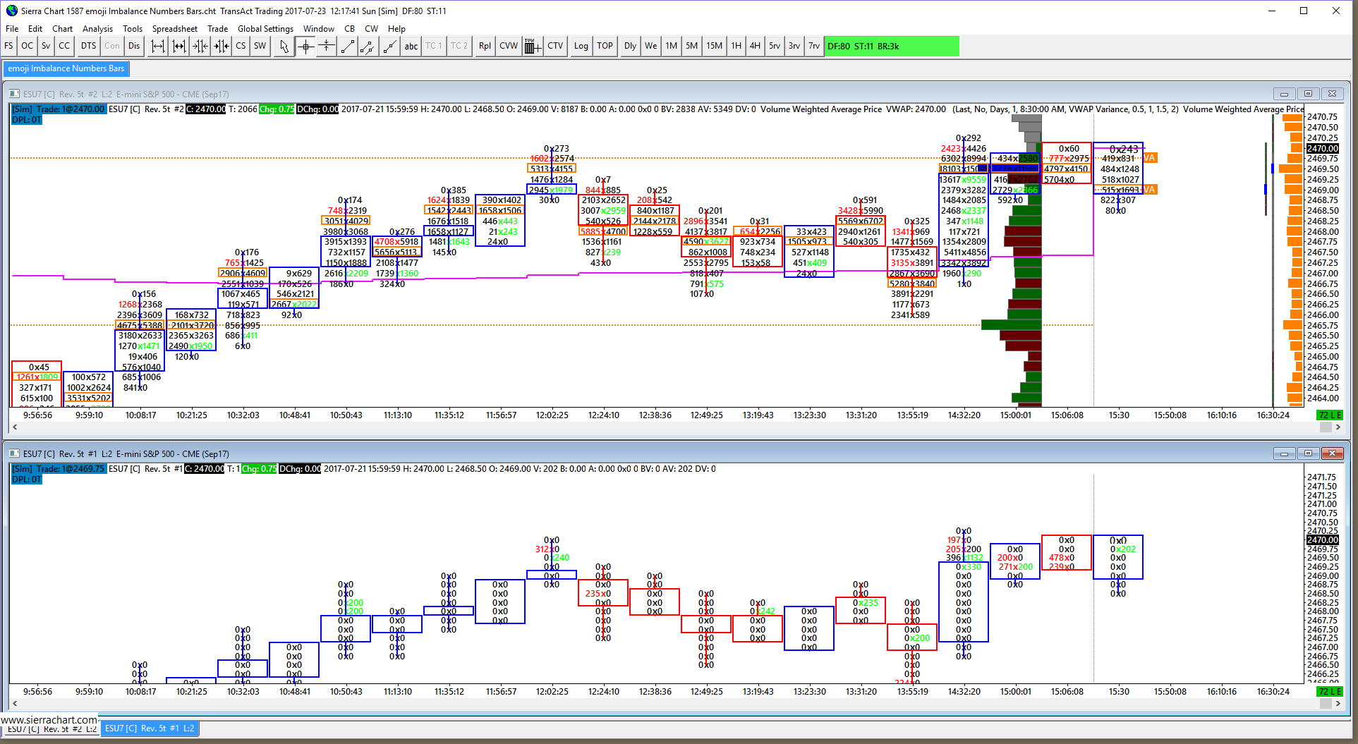 http://www.sierrachart.com/image.php?Image=1500830262847.png The attached file is quite a good implementation of chart layouts that you'll see presented on various Market Delta videos. It includes: - diagonal imbalance highlighting - right hand side Volume Profile for ETH, RTH, month - VWAP - trade filtering in the bottom chart This chart is set up for ES (change the symbol in Chart Settings) to match your broker using a 5 tick reversal and for the bottom chart trade filtering, 189 contracts. For the full Anthony Drager experience repeat the following phrases: "Like a bird in the sky" "Punch a guy in the face" Enjoy. Lee. Date Time Of Last Edit: 2017-07-24 05:28:41