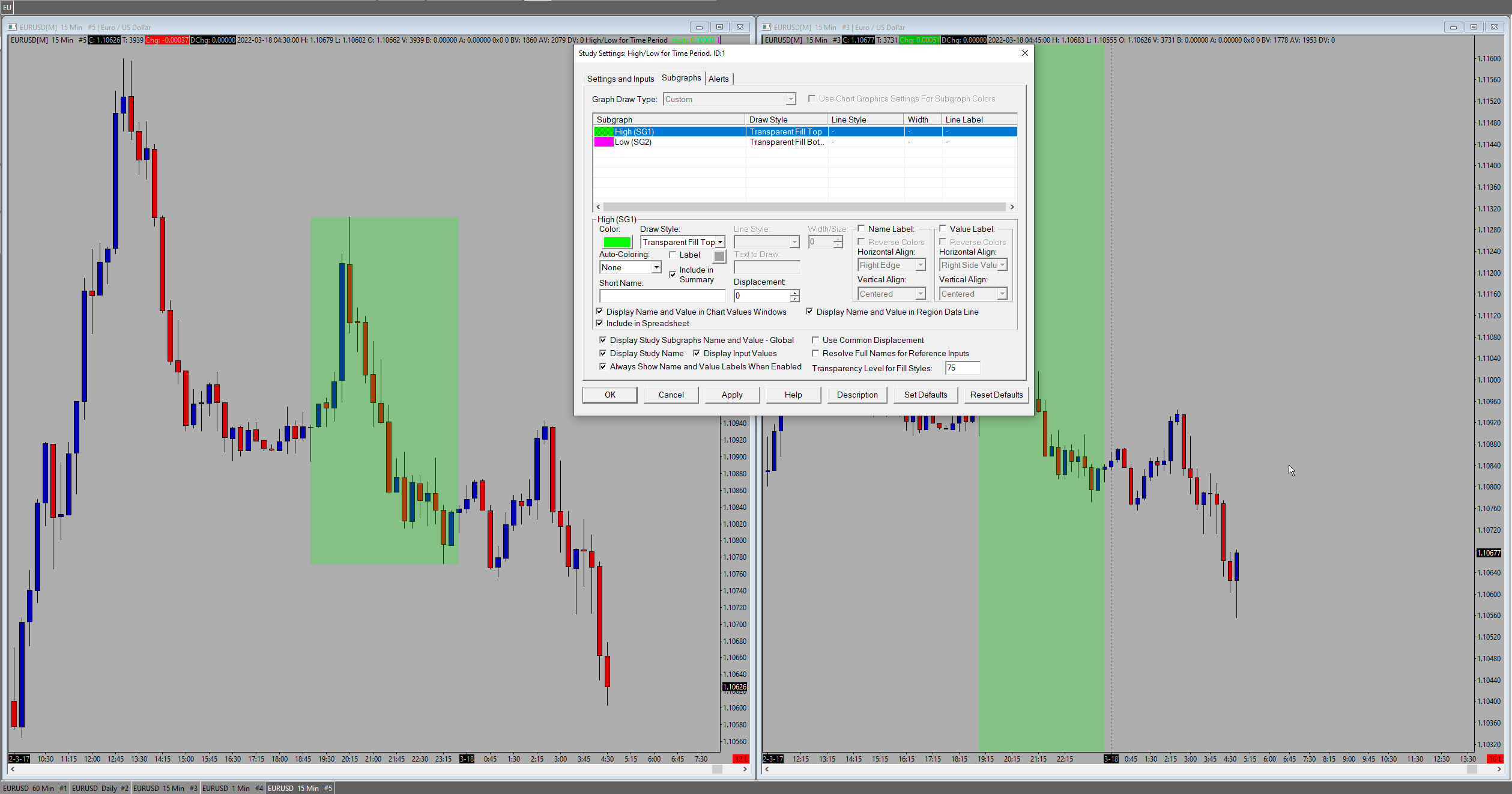 For this you will want to use the High/Low for Time Period Study: High/Low for Time Period Sierra Chart Support - Engineering Level Your definitive source for support. Other responses are from users. Try to keep your questions brief and to the point. Be aware of support policy: https://www.sierrachart.com/index.php?l=PostingInformation.php#GeneralInformation For the most reliable, advanced, and zero cost futures order routing, *change* to the Teton service: Sierra Chart Teton Futures Order Routing |