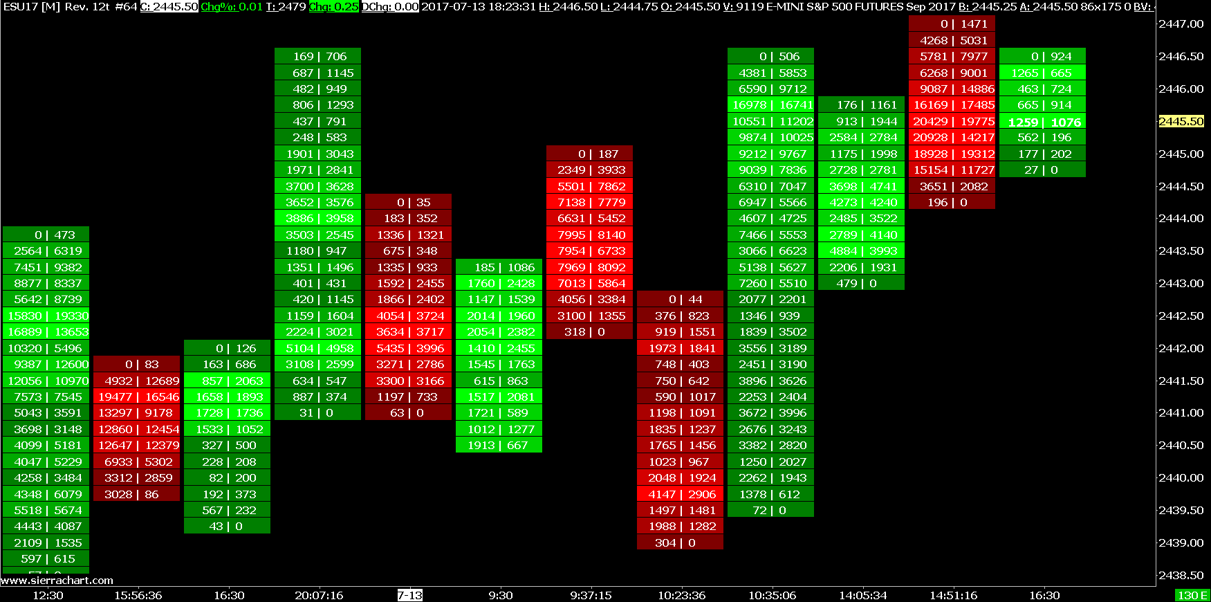 You need to set Sierra Chart to a tick by tick data configuration. Refer to: Tick by Tick Data Configuration This is what we see: http://www.sierrachart.com/image.php?Image=1499984622854.png Sierra Chart Support - Engineering Level Your definitive source for support. Other responses are from users. Try to keep your questions brief and to the point. Be aware of support policy: https://www.sierrachart.com/index.php?l=PostingInformation.php#GeneralInformation For the most reliable, advanced, and zero cost futures order routing, *change* to the Teton service: Sierra Chart Teton Futures Order Routing Date Time Of Last Edit: 2017-07-14 02:19:08