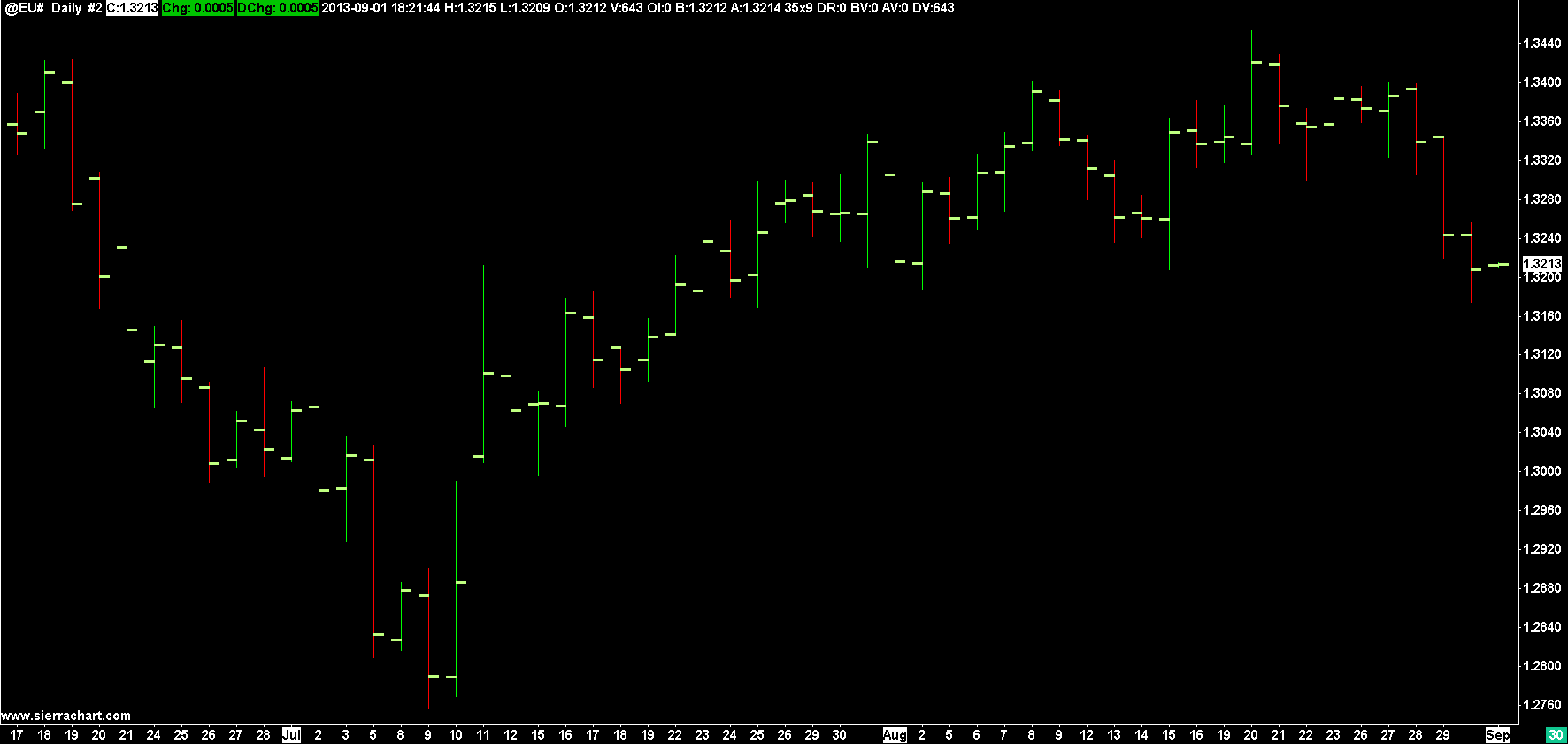 This is what we see: http://www.sierrachart.com/image.php?l=1378074710534.png Try re-downloading the recent data for that symbol through the Edit menu. Sierra Chart Support - Engineering Level Your definitive source for support. Other responses are from users. Try to keep your questions brief and to the point. Be aware of support policy: https://www.sierrachart.com/index.php?l=PostingInformation.php#GeneralInformation For the most reliable, advanced, and zero cost futures order routing, *change* to the Teton service: Sierra Chart Teton Futures Order Routing |