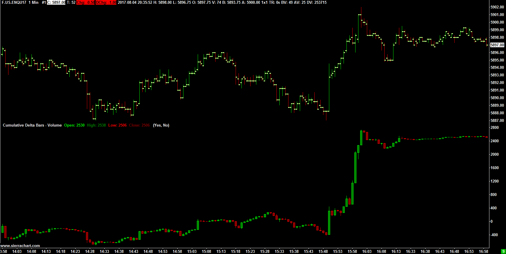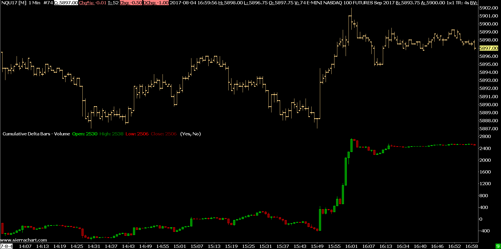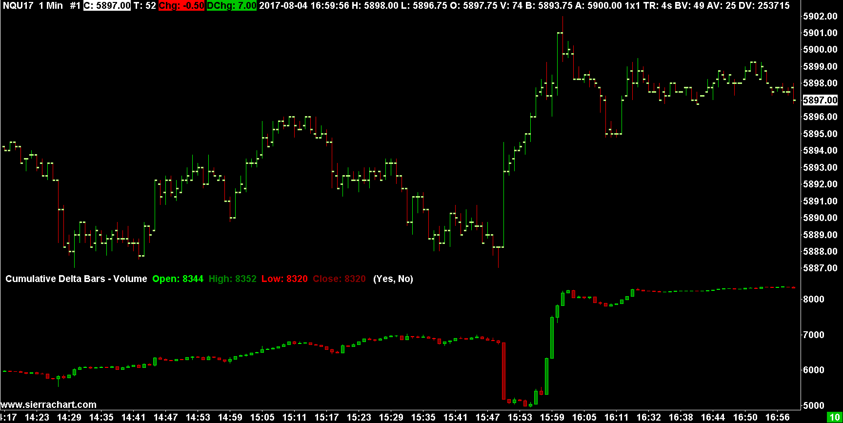 The Cumulative Delta Bar up/down tick version has a much higher correlation to price action. This does not mean it is necessarily more accurate or better.He is not using 1 tick for each display point but rather combines multiple ticks for one display point. The new feature in Sierra Chart to combine trades does not require a chart be set to one trade per bar. By the way, in version 1594, your "reconstruction of the tape" function is not working on 1000 trade bars for ES. You need to use the Sierra Chart Exchange Data Feed for this feature:Sierra Chart Exchange Data Feed It is not supported when using any other service because no other service provides the necessary data to do this. Although the only exception is CTS. Sierra Chart Support - Engineering Level Your definitive source for support. Other responses are from users. Try to keep your questions brief and to the point. Be aware of support policy: https://www.sierrachart.com/index.php?l=PostingInformation.php#GeneralInformation For the most reliable, advanced, and zero cost futures order routing, *change* to the Teton service: Sierra Chart Teton Futures Order Routing Date Time Of Last Edit: 2017-08-04 02:10:20
