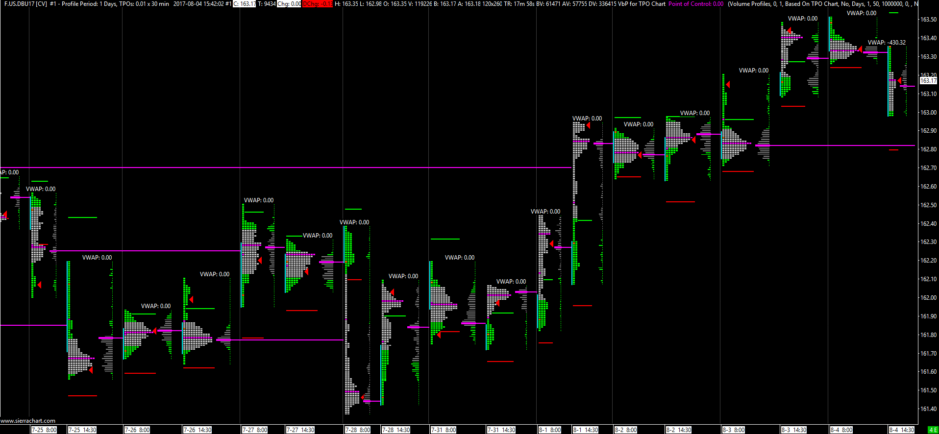 Hi, I have a daily chart with the following studies - TPO Profile Chart study - Volume By Price Study furthermore, I have evening session enabled. When set the Volume By Price Study input setting "Display Profile Volume Weighted Average Price" to "yes", above each volume profile it will display VWAP:0.00 except for the latest volume profile, which shows an incorrect number that changes every tick. Am I doing somewthing wrong or is this perhaps a bug? Rgds Will |