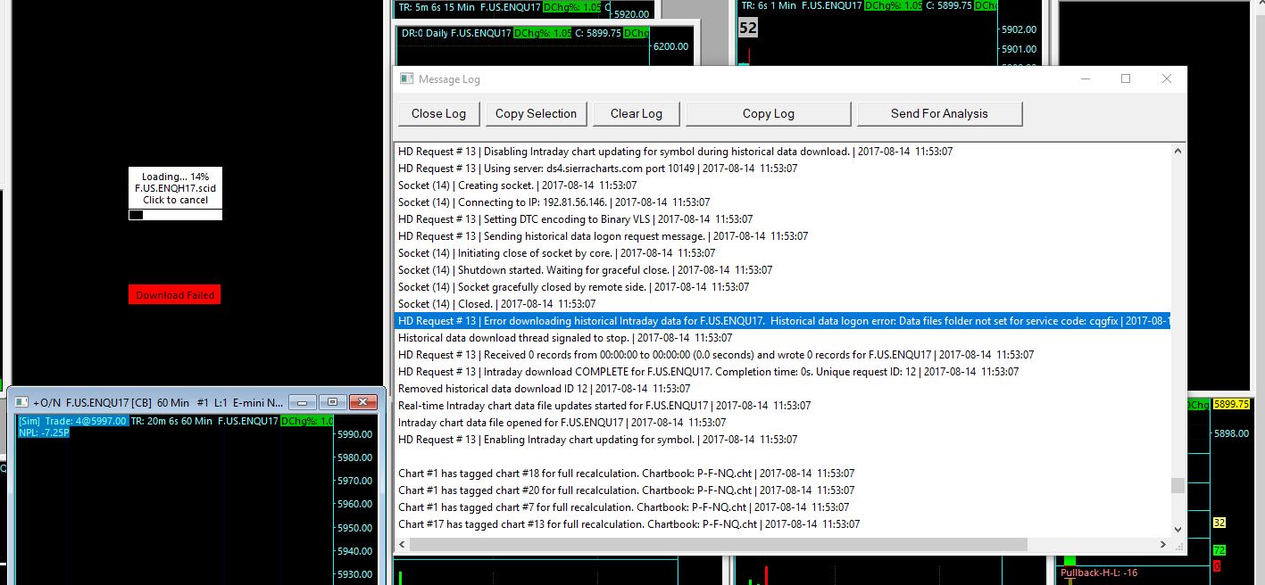 For some reason, I could not log onto my application in the last couple of days. And now when I start the application - it is giving me this error message - HD Request # 13 | Error downloading historical Intraday data for F.US.ENQU17. Historical data logon error: Data files folder not set for service code: cqgfix | 2017-08-14 11:53:07 See attached for the snapshot. This is for intraday charts. I tried just about all the options - Delete all Data Delete and Download data Edit/Download Data - intraday chart Reload Intra day charts And Yes; my connection is stable. PLEASE HELP! |