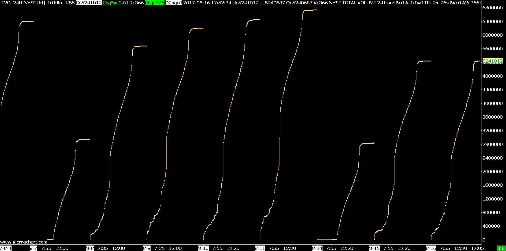 You definitely cannot measure volume with that symbol in the way that you are describing by looking at a Daily chart and the current day. It will not give you a consistent accurate value. To determine the total volume in a day, the appropriate symbol to use is this one: http://www.sierrachart.com/image.php?Image=1502920355109.png Sierra Chart Support - Engineering Level Your definitive source for support. Other responses are from users. Try to keep your questions brief and to the point. Be aware of support policy: https://www.sierrachart.com/index.php?l=PostingInformation.php#GeneralInformation For the most reliable, advanced, and zero cost futures order routing, *change* to the Teton service: Sierra Chart Teton Futures Order Routing Date Time Of Last Edit: 2017-08-16 22:00:05
