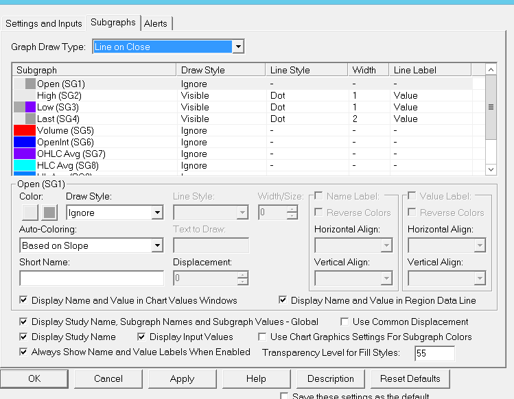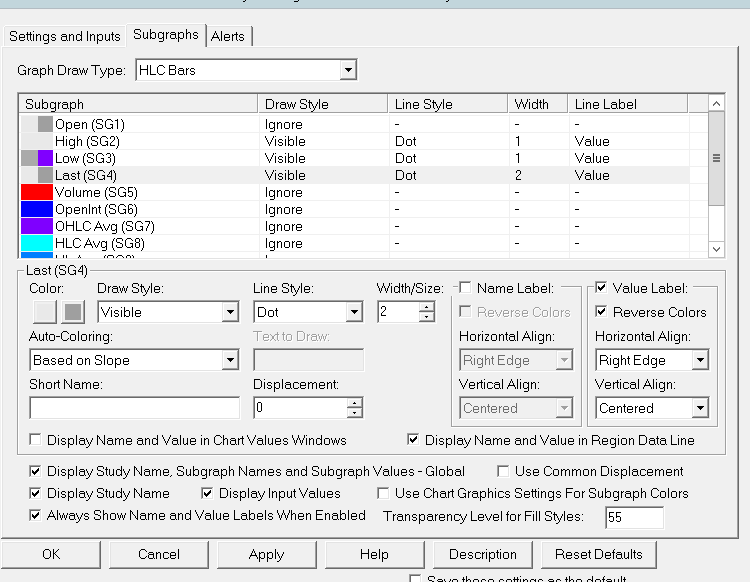 Hi, using Price/Study Overlay (see setting file sc_slop1). When I set HLC bar, the Last value has option for Auto color (high / low) based on slop, but it doesn't work, it defaults to the high color even while the slope is down! (see file sc_slop2). When I set to Line on Close, then the Auto color (high /low ) works perfectly for Last value, when slope is up the high color is use and when slope is down the low color is use, (see file sc_slop3). So I would like the HLC bar to Auto color base on slope just like the Line on Close. Thanks, I thinks it should be easy for you to test, and hopefully to fix.