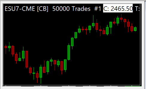 I'm trying to clean the clutter off my charts. How can I remove this top bar of data? In the attached image, it says: ESU7-CME [CB] 50000 Trades #1 C:2465.50 T:... |