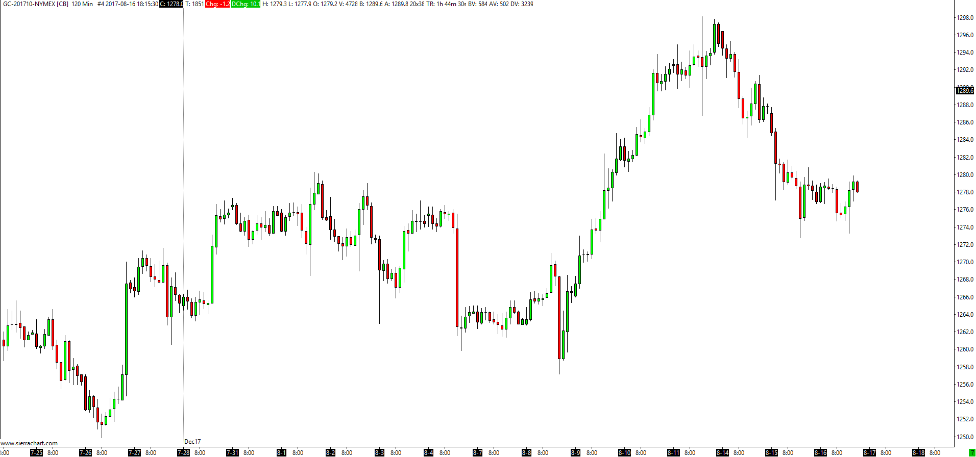The October gold contract is not actively traded. Still, the chart should update in real time and that is what we are seeing even when it is set to a Continuous Futures Contract chart. What are the Session Times of the chart set to? Sierra Chart Support - Engineering Level Your definitive source for support. Other responses are from users. Try to keep your questions brief and to the point. Be aware of support policy: https://www.sierrachart.com/index.php?l=PostingInformation.php#GeneralInformation For the most reliable, advanced, and zero cost futures order routing, *change* to the Teton service: Sierra Chart Teton Futures Order Routing Date Time Of Last Edit: 2017-08-23 17:47:04