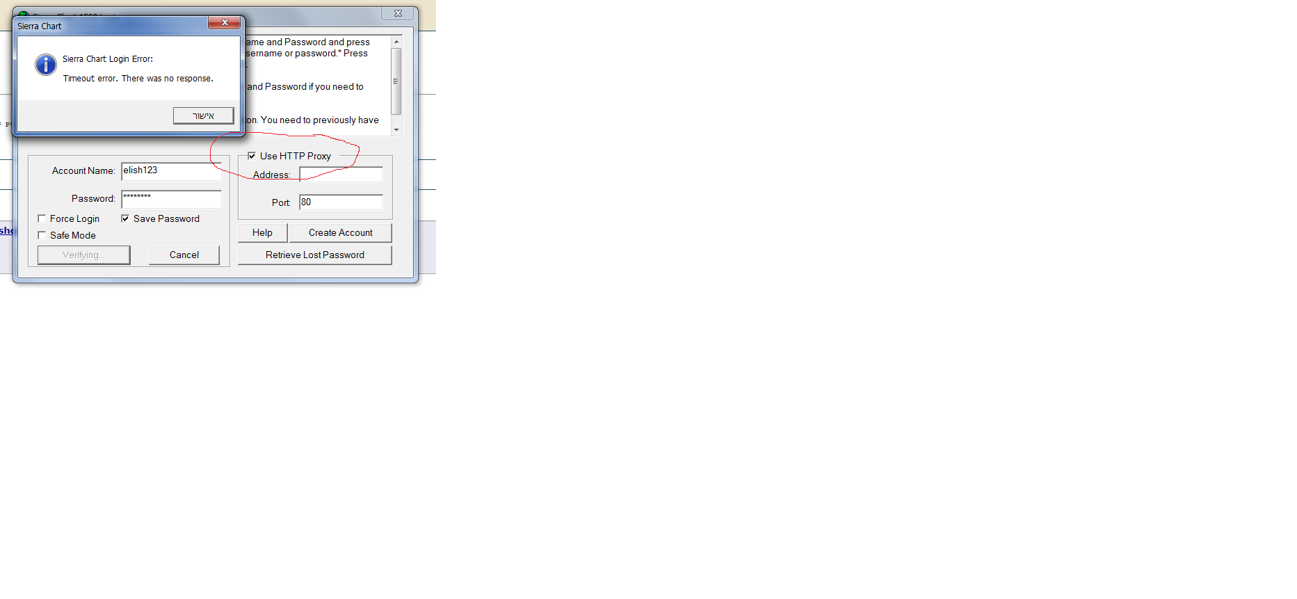 That thread is not relevant. It is old. Do you require a proxy server to connect? If not, then disable the Use HTTP Proxy option. Sierra Chart Support - Engineering Level Your definitive source for support. Other responses are from users. Try to keep your questions brief and to the point. Be aware of support policy: https://www.sierrachart.com/index.php?l=PostingInformation.php#GeneralInformation For the most reliable, advanced, and zero cost futures order routing, *change* to the Teton service: Sierra Chart Teton Futures Order Routing |