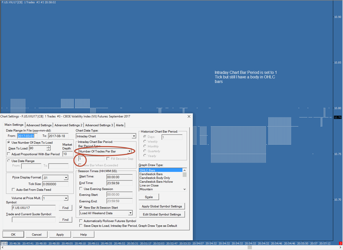 How the VIX futures OHLC bar on the chart can have a body if the bar beriod is set to 1 tick (please see attached picture) ?