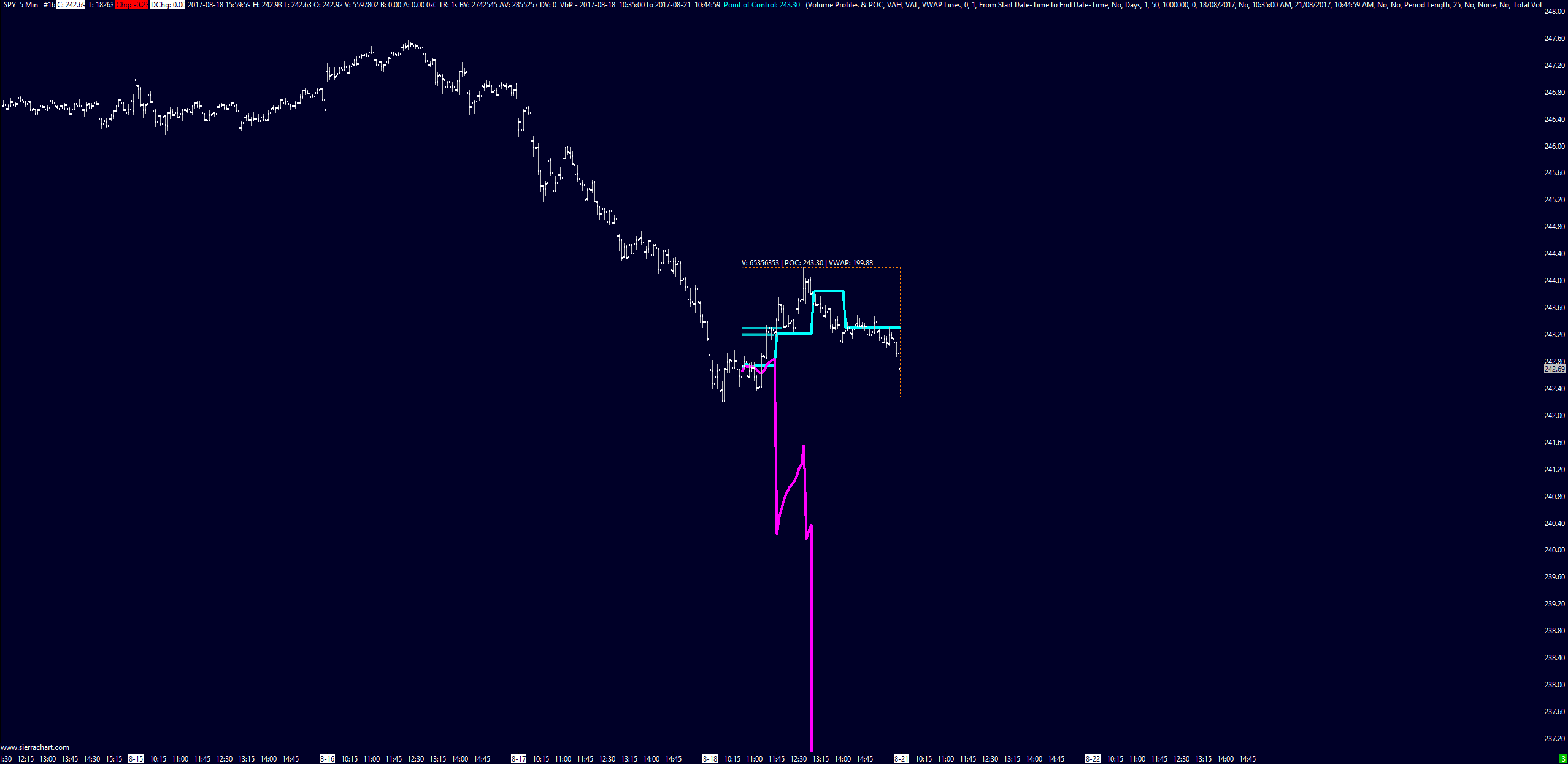 I am still using version 1568. When I draw volume profile using the tool and adjust the period, everything draws just fine and very quickly. An only annoying thing is the VWAP standard deviation lines. They stay in the graph drawn as the longest period boundaries the selected volume profile set previously. Even after boundaries modification. Until now I just got over it, but it starts to mess my graphs up. Has this issue been solved in versions later then 1568? Thank you. Z. Please see attached picture which shows the bad behavior on basic clean chart. http://www.sierrachart.com/image.php?Image=1503257388452.png |