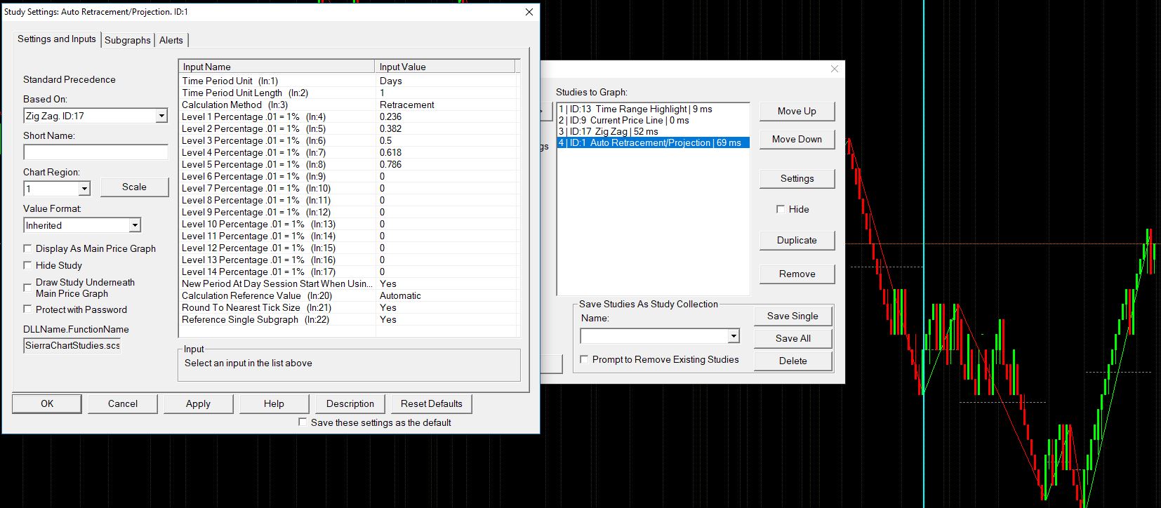 This is what we see with this configuration: http://www.sierrachart.com/image.php?Image=1503752024339.png The only problem we observed is because the Zig Zag line does not extend all the way to the end of the chart most of the time, the retracement/projection lines, for those chart bars is not accurate because it is based upon a 0 Subgraph value. While this is not the most ideal solution, the solution to this is to set the Scale Range for the Auto Retracement/Projection study to Same as Region. Refer to : Chart Scale and Scale Adjusting: Scale Range (Scale Settings) (Scale Range) Sierra Chart Support - Engineering Level Your definitive source for support. Other responses are from users. Try to keep your questions brief and to the point. Be aware of support policy: https://www.sierrachart.com/index.php?l=PostingInformation.php#GeneralInformation For the most reliable, advanced, and zero cost futures order routing, *change* to the Teton service: Sierra Chart Teton Futures Order Routing Date Time Of Last Edit: 2017-08-26 13:47:54