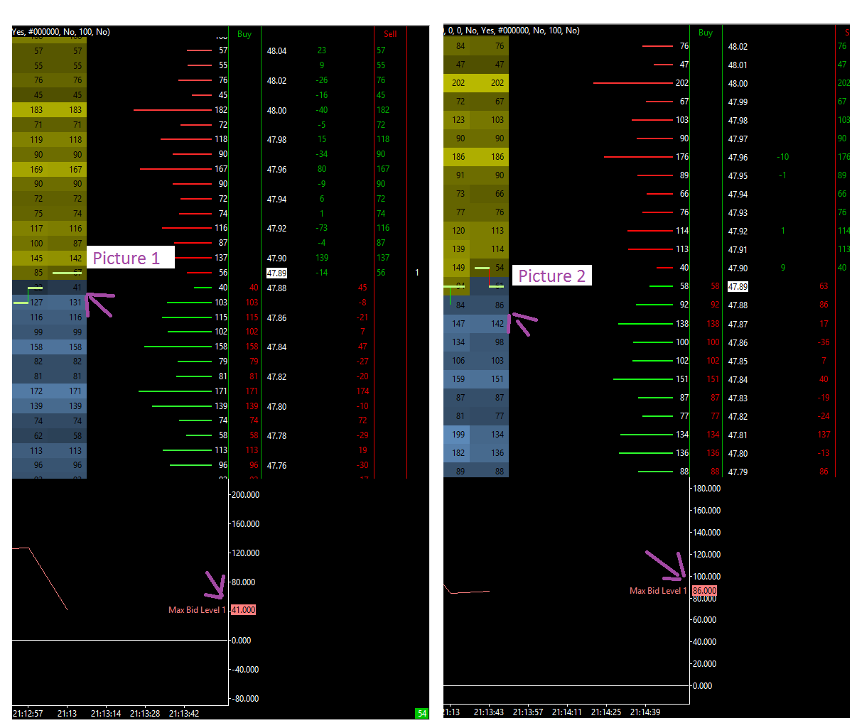 Hi, On the studies Bid & Ask Depth Bars there have 1 error to bid side Level1 only. calculation mode: Sum Bid Side Source Data : Historical Market Depth-Max Maximum Depth Levels To Use(): 1 Has you can see on the Joint picture I add the studies Market Depth Historical Graph and named Line of the error Max Bid Level1. For more precision; ScreenShot1. Price are At ask level 1 and the studies calcul Right whit the Input Historical Market Bid Depth Max. ScreenShot2. Price are to Bid Level 1 and the studies calcul Wrong whit the Input Historical Market Bid Depth Max. What can be done? Thx for answer. Xavier |