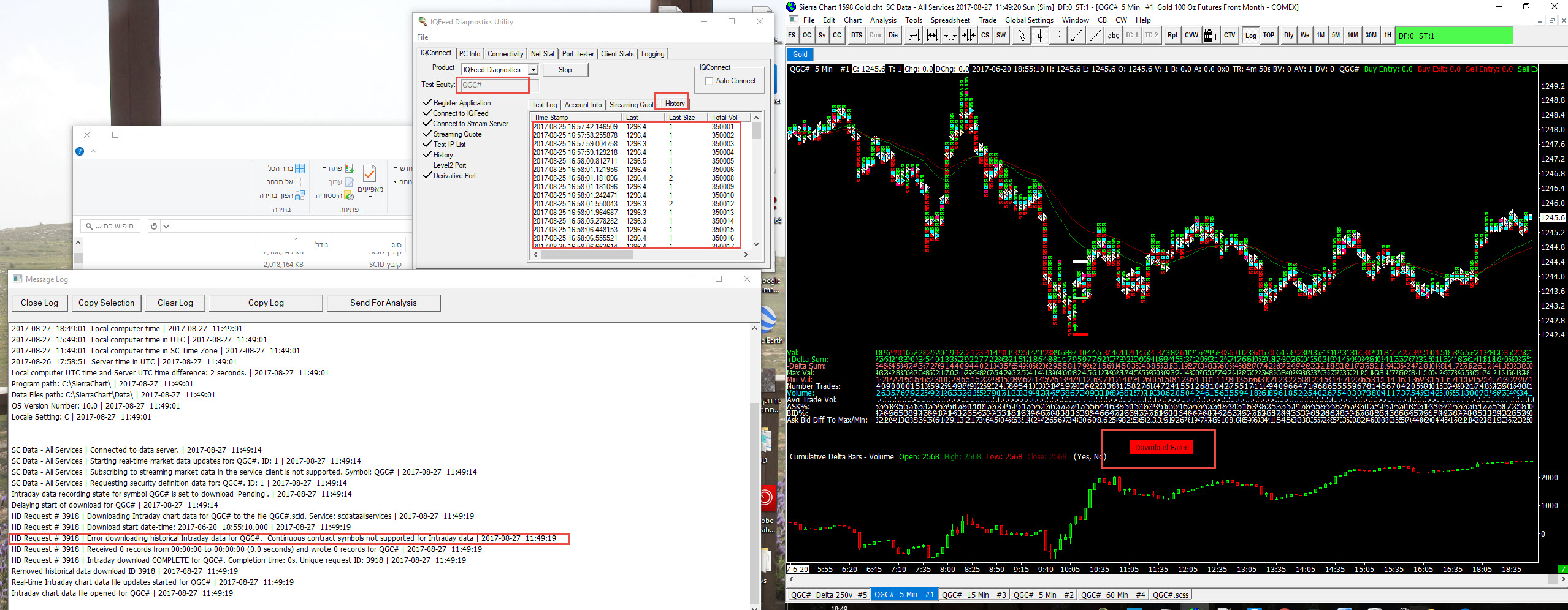 SC Data - All Services | Starting real-time market data updates for: QGC#. ID: 1 | 2017-08-27 00:04:56 SC Data - All Services | Subscribing to streaming market data in the service client is not supported. Symbol: QGC# | 2017-08-27 00:04:56 SC Data - All Services | Requesting security definition data for: QGC#. ID: 1 | 2017-08-27 00:04:56 Intraday data recording state for symbol QGC# is set to download 'Pending'. | 2017-08-27 00:04:56 Delaying start of download for QGC# | 2017-08-27 00:04:56 HD Request # 3879 | Downloading Intraday chart data for QGC# to the file QGC#.scid. Service: scdataallservices | 2017-08-27 00:05:01 HD Request # 3879 | Download start date-time: 2017-06-20 18:55:10.000 | 2017-08-27 00:05:01 HD Request # 3879 | Error downloading historical Intraday data for QGC#. Continuous contract symbols not supported for Intraday data | 2017-08-27 00:05:01 HD Request # 3879 | Received 0 records from 00:00:00 to 00:00:00 (0.0 seconds) and wrote 0 records for QGC# | 2017-08-27 00:05:01 HD Request # 3879 | Intraday download COMPLETE for QGC#. Completion time: 0s. Unique request ID: 3879 | 2017-08-27 00:05:01 Removed historical data download ID 3879 | 2017-08-27 00:05:01 Real-time Intraday chart data file updates started for QGC# | 2017-08-27 00:05:01 Intraday chart data file opened for QGC# | 2017-08-27 00:05:01 using ver 1598 i do get the intraday data through other applications. this is duplicated to any other continues contract would be happy to solve thanks Date Time Of Last Edit: 2017-08-27 04:08:16