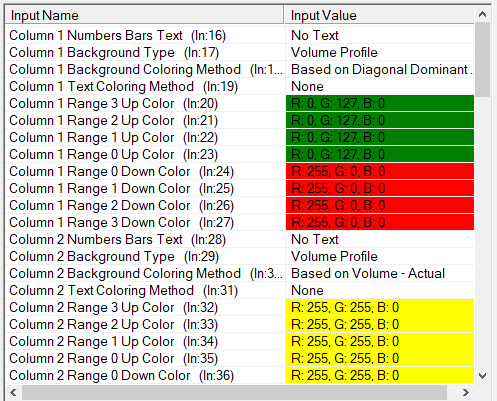 Basically there are two possibilities. We can add a default background color. Or you can set the Column 1 Background Coloring Method to Based on Volume Percentage and use the same color for all eight of the colors for the first Numbers Bars column. Then use the Column 1 Text Coloring Method for the diagonal comparisons. This way you will see always a complete Volume Profile when there is no dominant side on either the bid or ask side of a price level and therefore no Volume Profile shown. Sierra Chart Support - Engineering Level Your definitive source for support. Other responses are from users. Try to keep your questions brief and to the point. Be aware of support policy: https://www.sierrachart.com/index.php?l=PostingInformation.php#GeneralInformation For the most reliable, advanced, and zero cost futures order routing, *change* to the Teton service: Sierra Chart Teton Futures Order Routing Date Time Of Last Edit: 2017-08-31 17:02:04