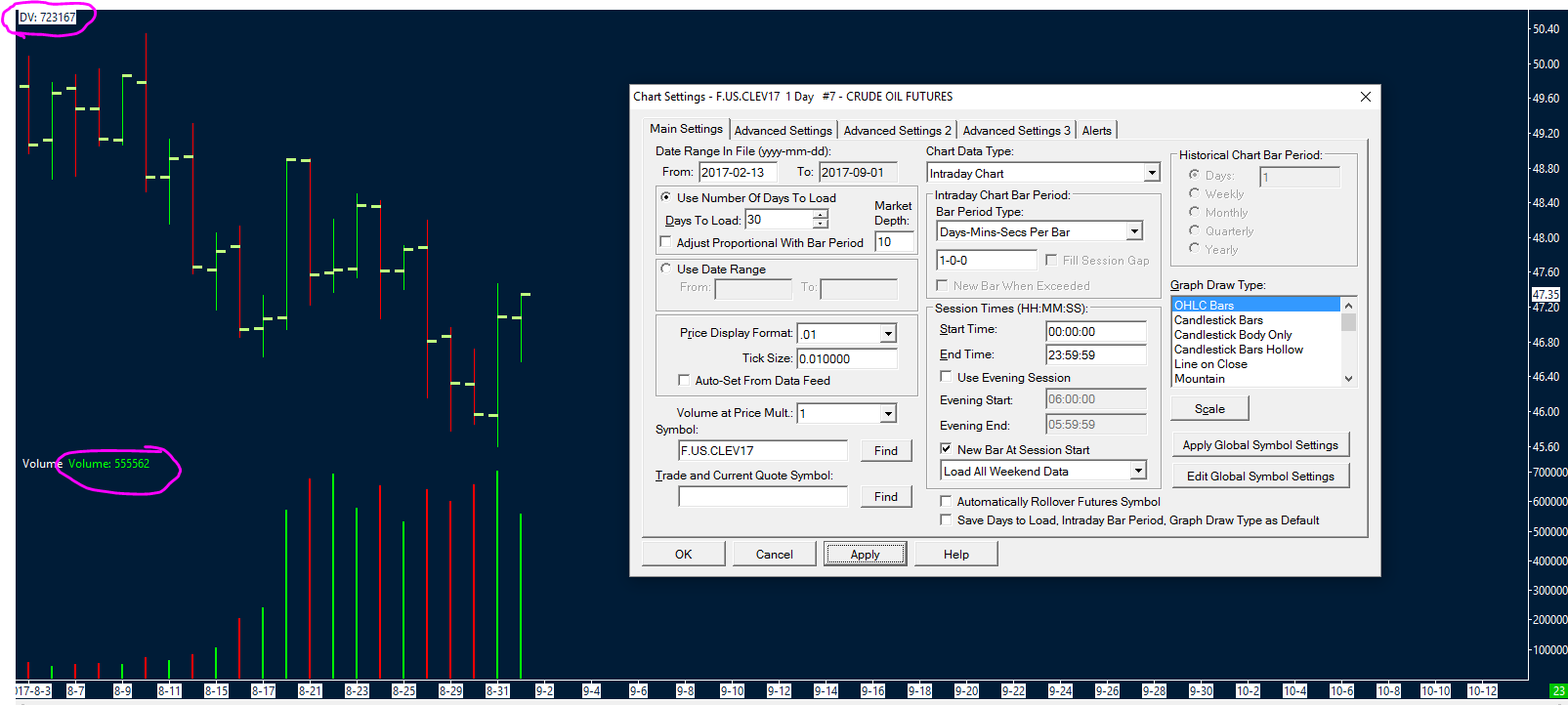 Hi SC, I hit the volume issue. Please take a look at the picture. Daily volume in the chart header shows DV 723 167, but the volume study shows only 555 562. I believe my chart or trade service setting is correct. My data feed vendor is CQG. Also, checked the daily volume on Nymex and the correct number is DV in the chart header. Thank you. |