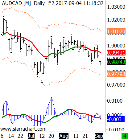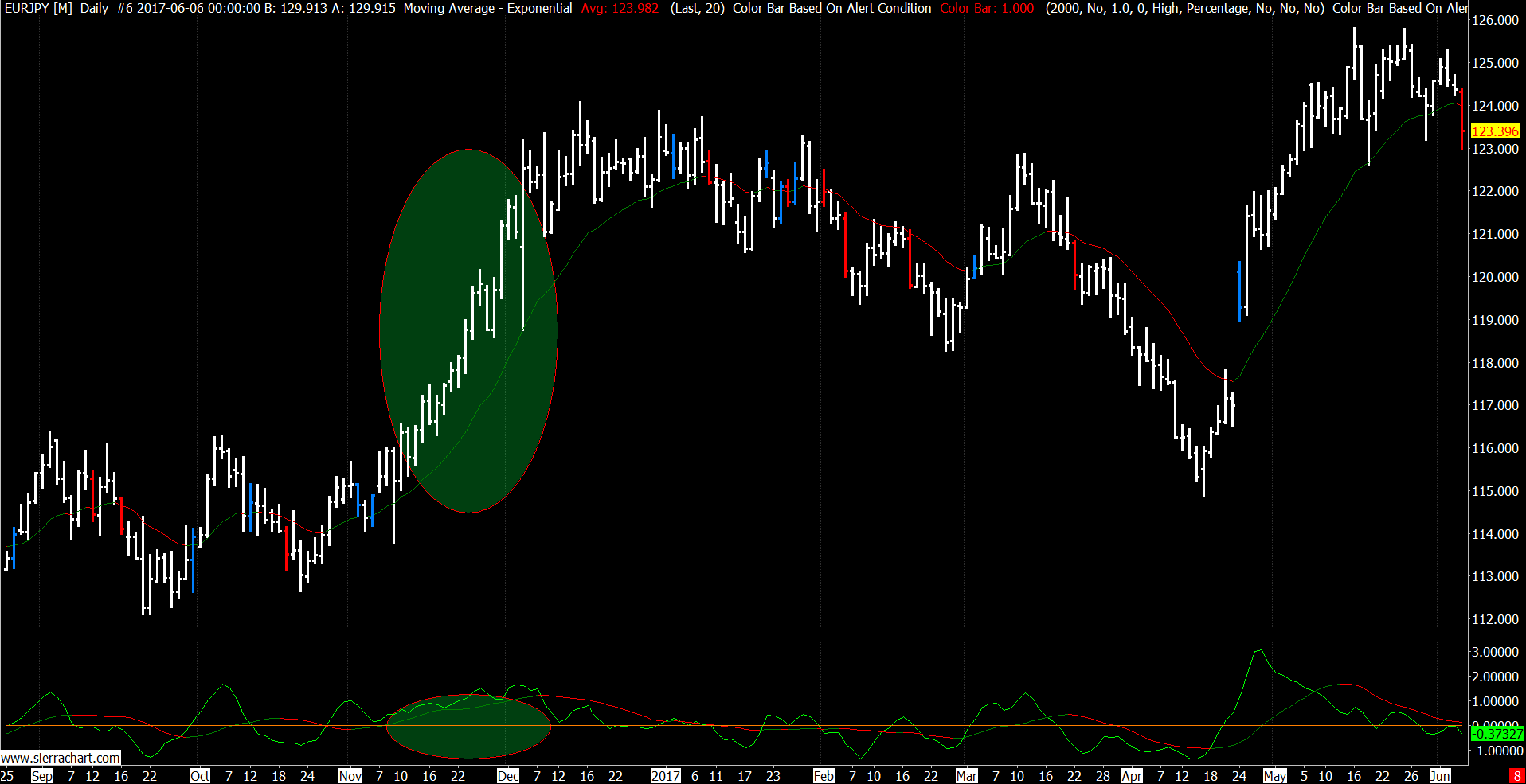 You'll need two instances of the Color Bar Based On Alert Condition study, one for each color/direction. Try this: Put these formulas on the alerts tab of the respective color bar study: Green bar: =OR(