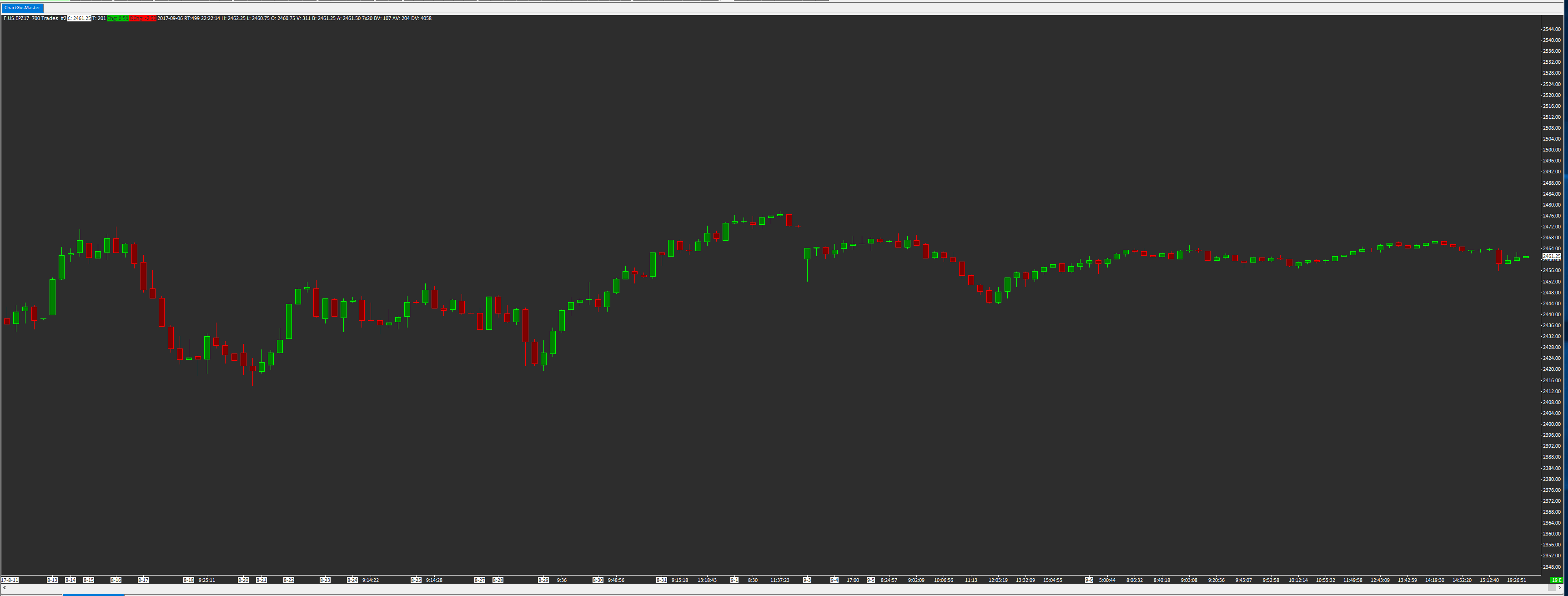 I've been using Number of Trades per Bar for my intraday charts. Today, suddently, where there would've been perhaps 30 or 40 candles now I have very few, maybe 5 or 6. Is there an obvious reason for this sudden change? is there a way to go back to the way it was before as it affects my setups? I have attached a screenshot to demonstrate the issue. This is a 700 trades per bar chart. As you will see, moving back each day, the bars become more compressed to the point that only a few bars per day print when going back a few days. Thanks, Date Time Of Last Edit: 2017-09-07 03:28:14