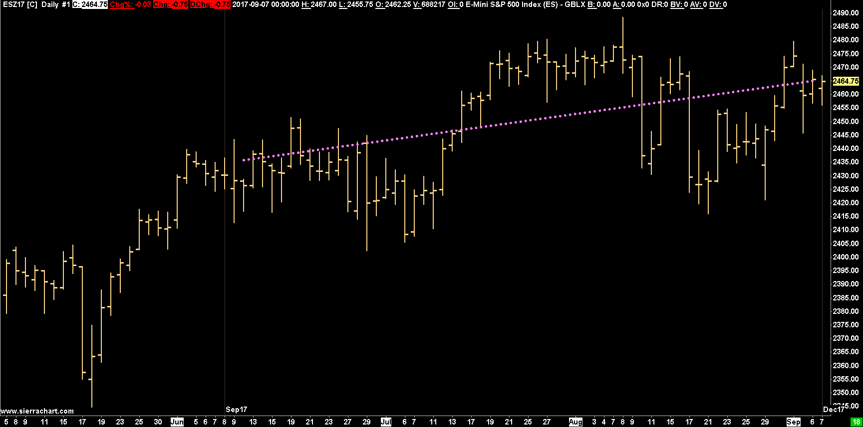 We did not change anything from our side. This is a specific issue on your side only. Globex 24hour all time high on 8/7/2017 for ES now shows 2486.25 with the rollover When I look at just the DEC contract the high on 8/7/2017 is 2486.25 Refer to the information here: http://www.sierrachart.com/index.php?page=doc/ContinuousFuturesContractCharts.html#DisplayingRolloverTransitionTimesAndContractMonths You need to know what contract month you are looking at for a particular date in the chart. If there is an issue with that, we can help. Sierra Chart Support - Engineering Level Your definitive source for support. Other responses are from users. Try to keep your questions brief and to the point. Be aware of support policy: https://www.sierrachart.com/index.php?l=PostingInformation.php#GeneralInformation For the most reliable, advanced, and zero cost futures order routing, *change* to the Teton service: Sierra Chart Teton Futures Order Routing |