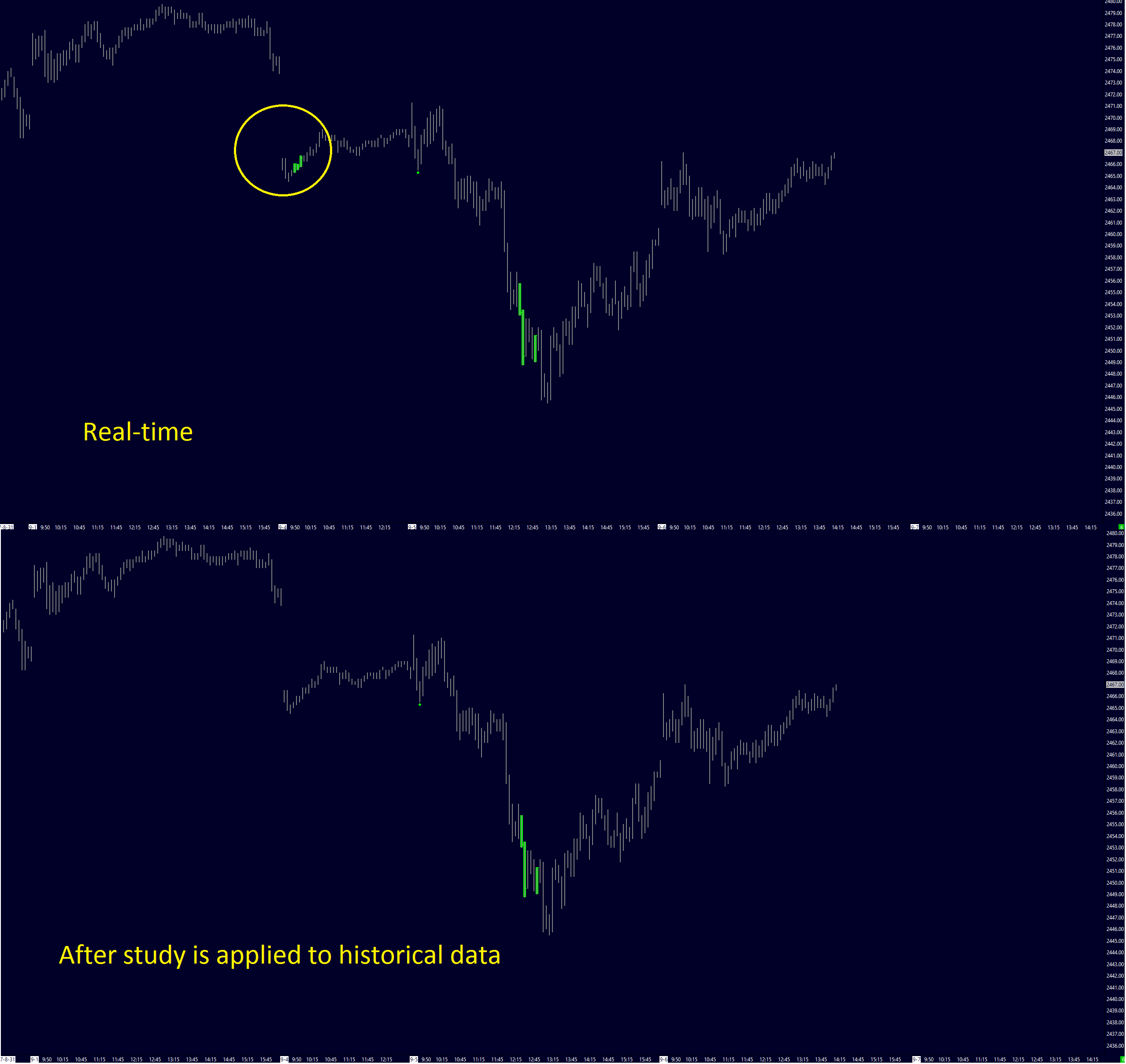 See image attached illustrate what i'm referring to. Color bar alerts are correct based on Real-time data, however, some alerts are not recorded based on historical data( This is to be expected based on my alert conditions). I want to some how record or store the Real-time alerts, or at least keep them from recalculating so that I would have to remove and re-add the study in order to recalculate. Is there any potential solution to this? |
