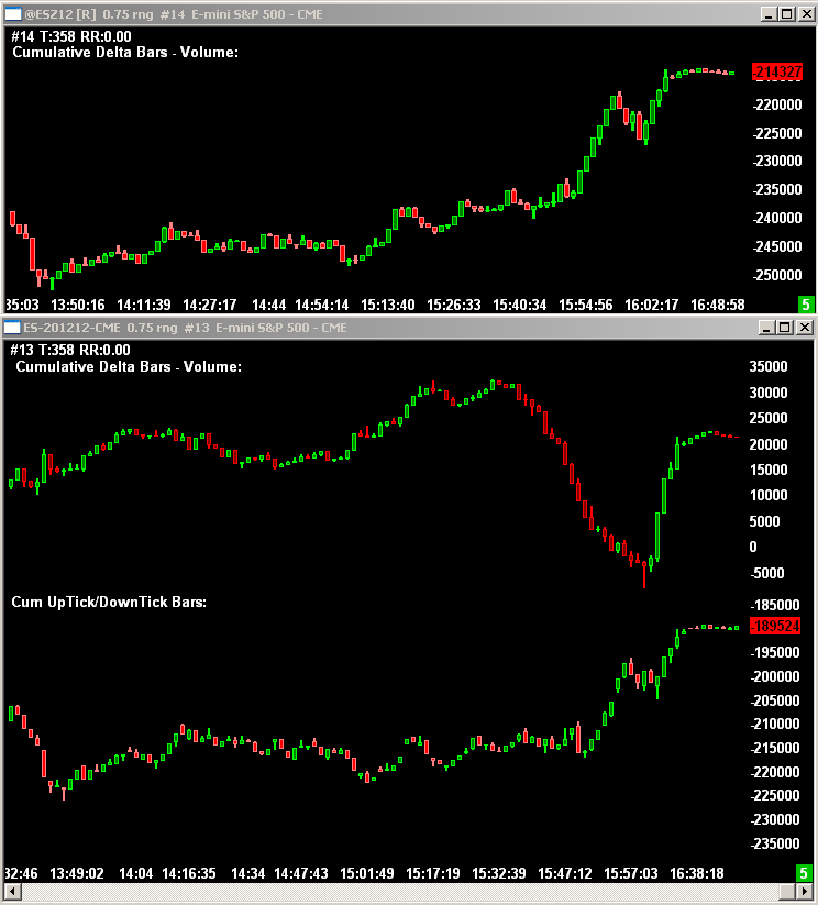 I use TT data as well. It is fast and reliable, but has poor bid/ask accuracy. The Cumulative Delta Bars - Up/Down Tick Volume study with TT data is very close to the Cumulative Delta Bars - Volume study with IQFeed data. Attached is a comparison I did last year. The upper panel is Cumulative Delta Bars - Volume study with IQFeed data. The middle panel is Cumulative Delta Bars - Volume study with TT data. The lower panel has cumulative delta bars made from Up/Down ticks with TT data. Date Time Of Last Edit: 2013-09-06 15:11:43