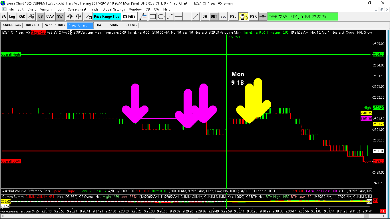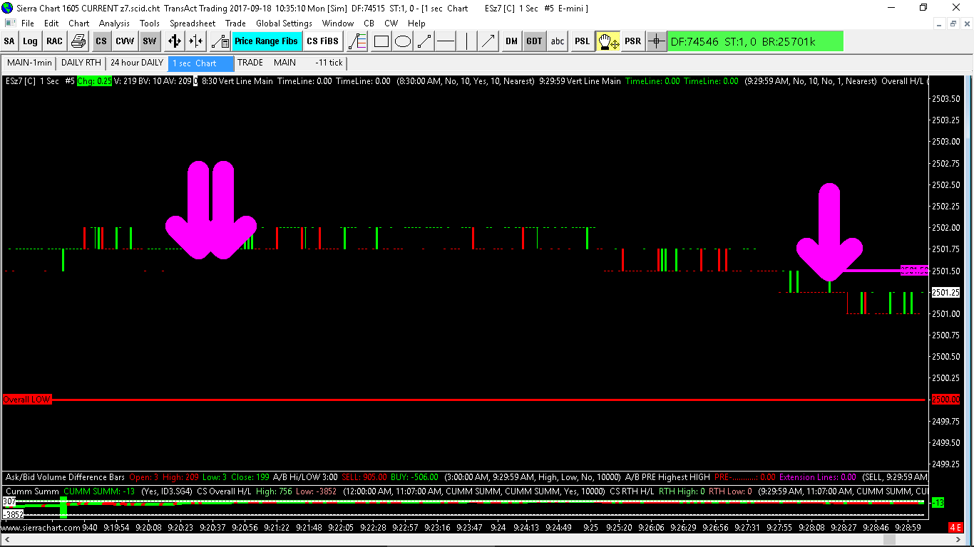 For me the studies this happens to is typically the "Colored Bar based on Alert Condition". In this particular chart, that study is applied to a Cumulative Study of the Ask/Bid Difference. 1. Here you can see the Yellow Arrow covers up the price bar. The settings are "Input Data=High" and "Ticks offset=0". Any Arrow size set to higher than ~4 covers the price bar. So you can see it truly isn't at the "High". http://www.sierrachart.com/image.php?Image=1505744781439.png 2. Here you can see the Magenta Arrow not only covers the price bar, but the extension line covers the Value Label. The settings are "Input Data=High" and "Ticks offset=0" and "Value Label=Right Edge" . I need to see the level that the arrow goes off at. Yes, I know I could set the Value Label to the "Values Scale", but I simplified the chart a lot for your view, and that would add to already a lot of labels in the value scale. Thx http://www.sierrachart.com/image.php?Image=1505745318734.png Date Time Of Last Edit: 2017-09-18 14:46:59
